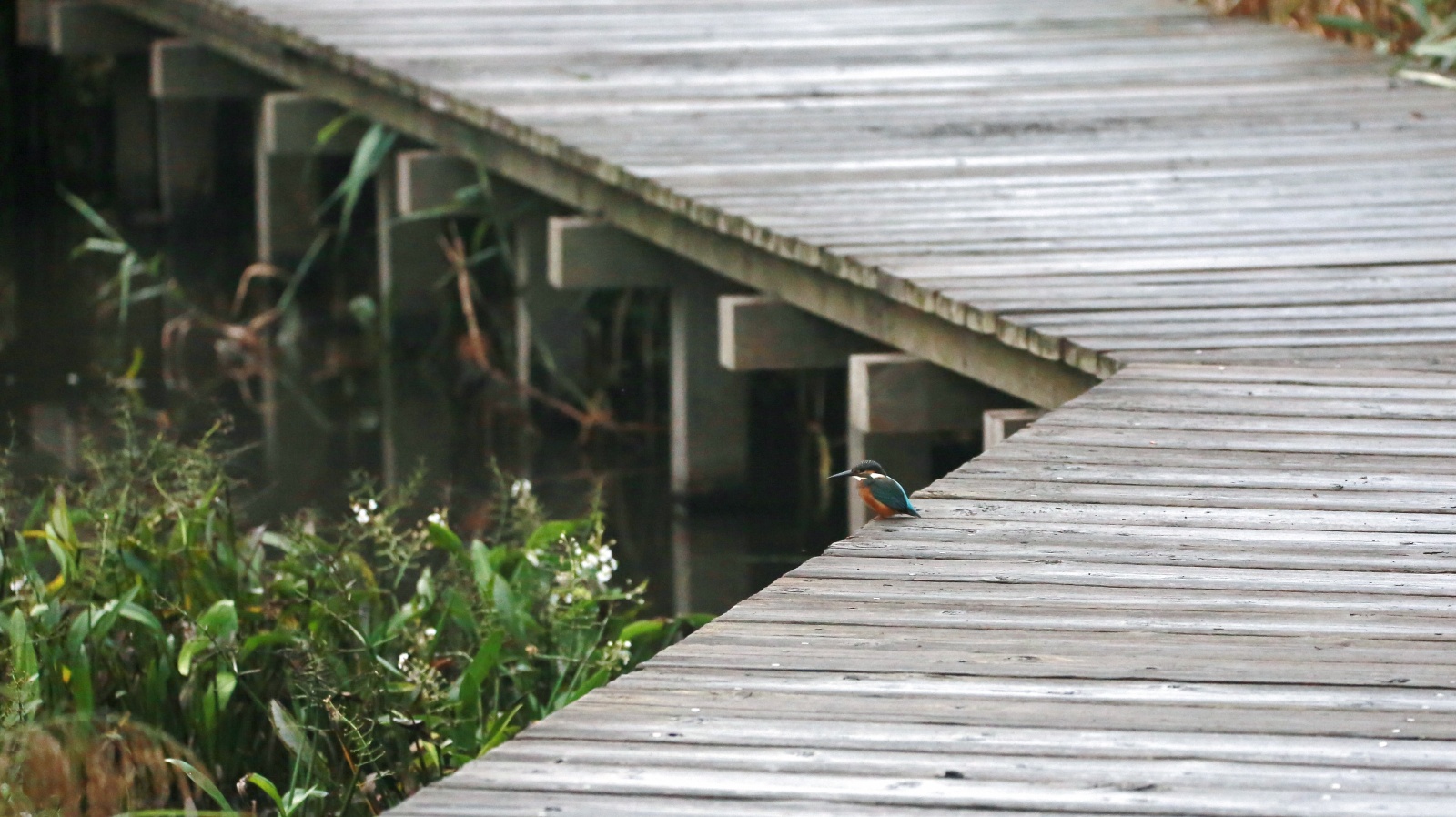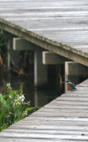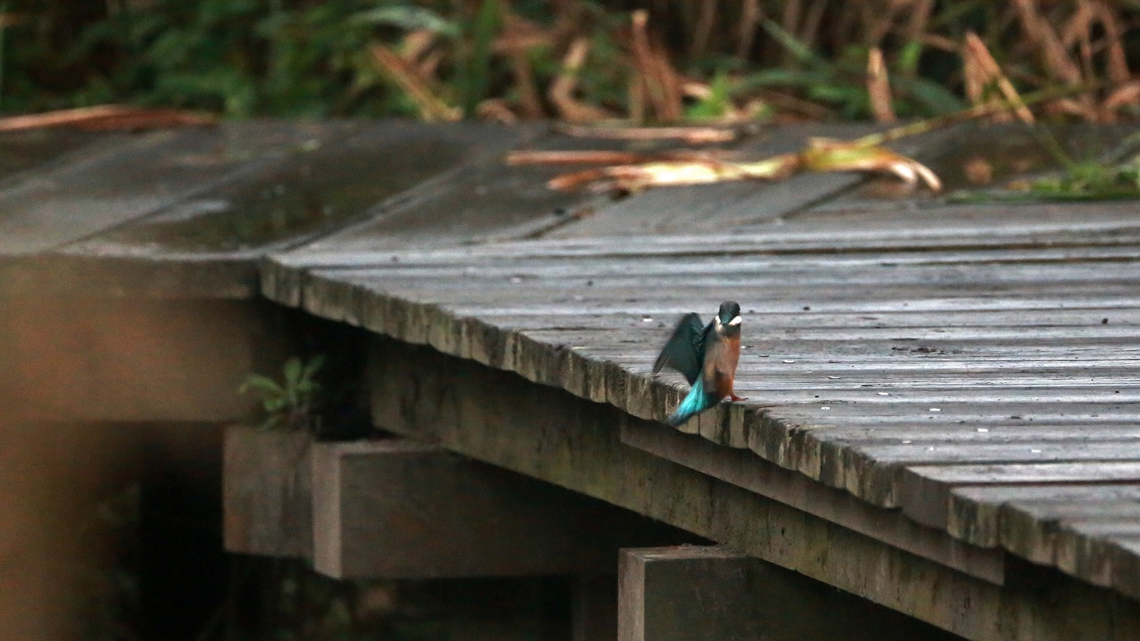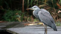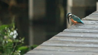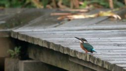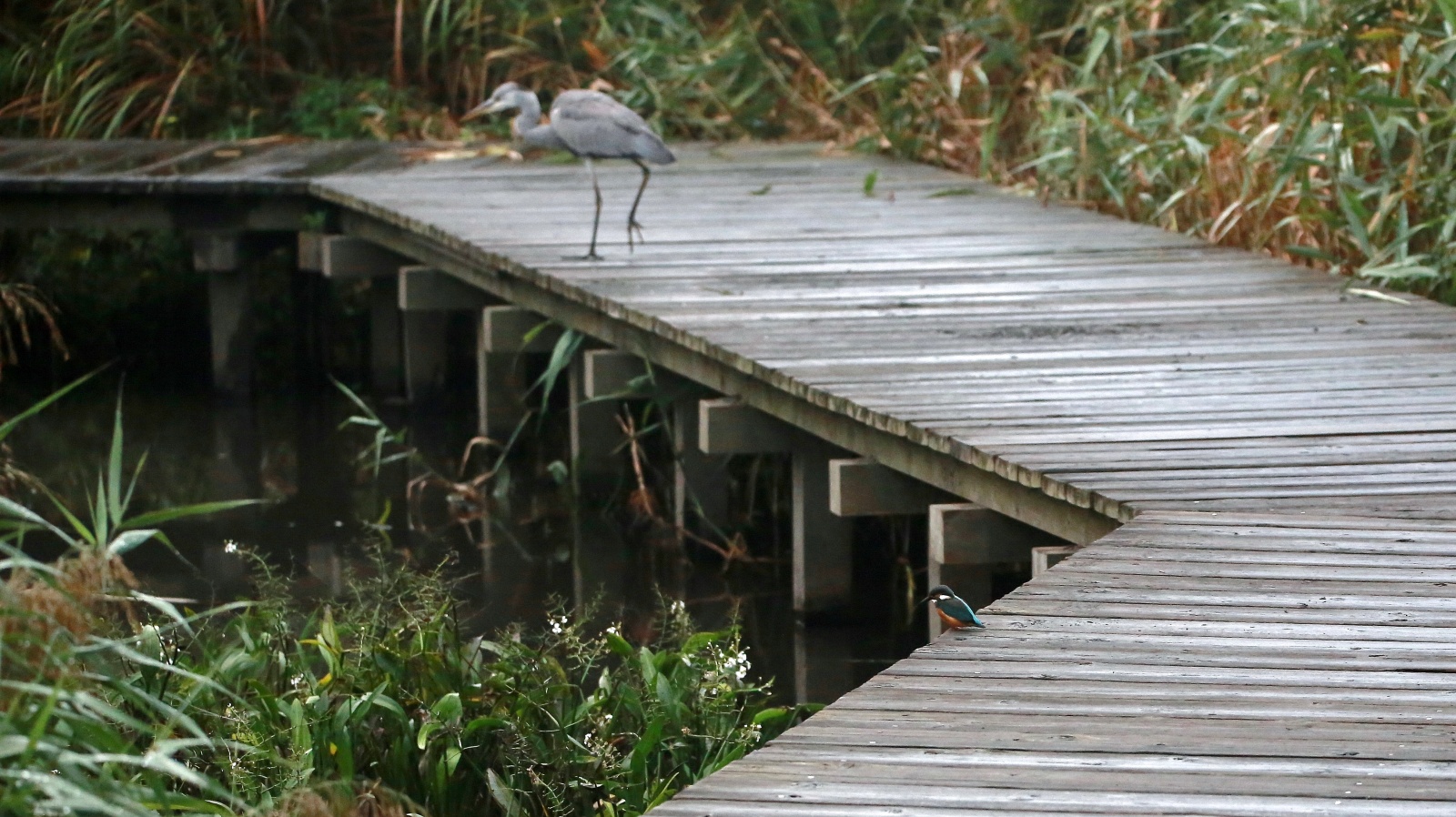 急に~上を気にしたと思ったら、アオサギが木道に舞い降りました!……でも少し離れていたので意外に気にしない翡翠君です。 ……そんな事より~ ごはん!ごはん!…(笑)