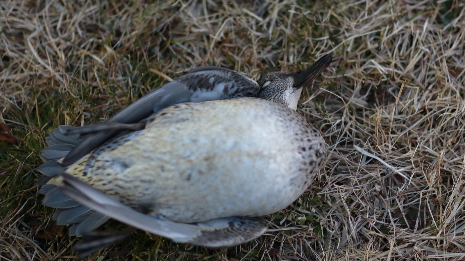 ◎~~今朝のワン達! 早朝散歩で鳥が死んでいました……? 少し大きめな鳥で薄暗い中で撮った写真で確認すると、水かきもある様だし~コガモ♀のようです。
