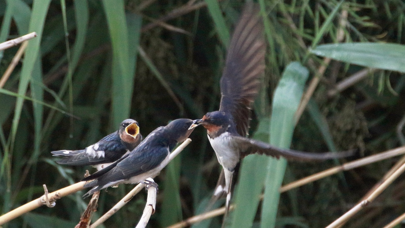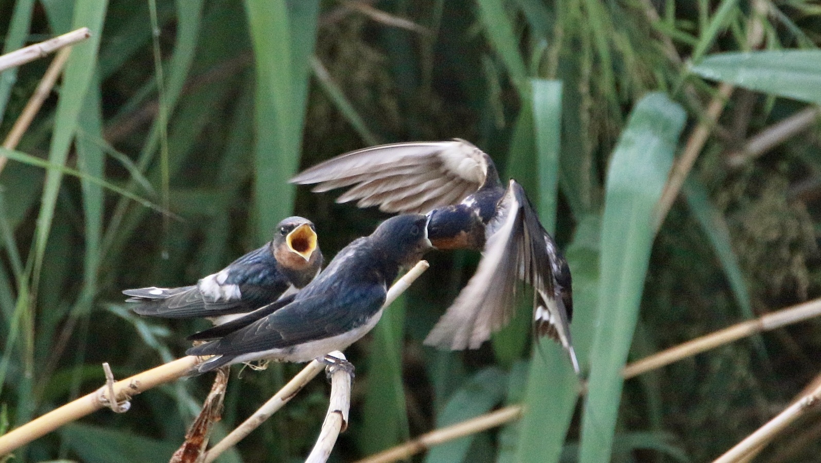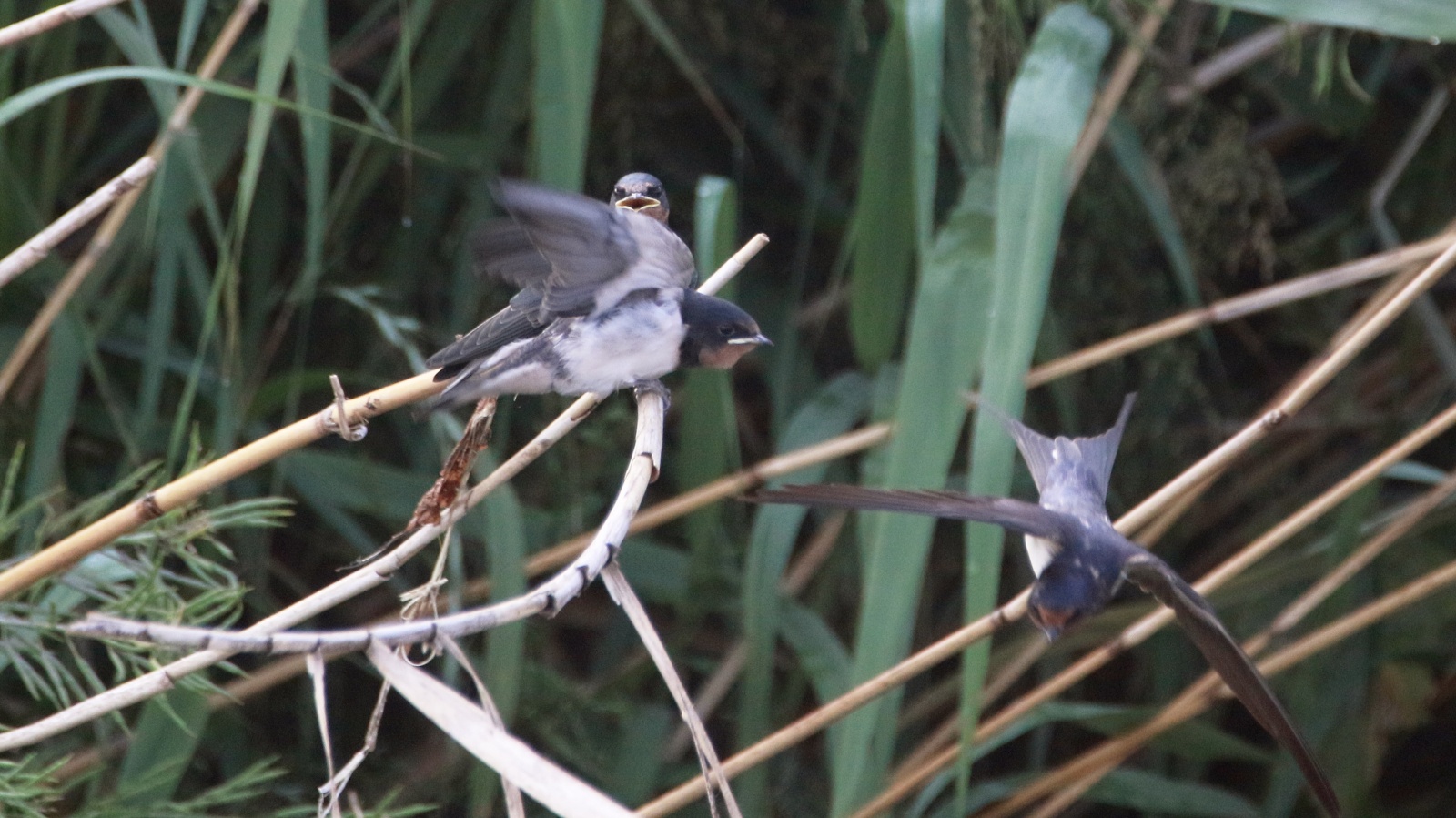 去年は同じ場所でまだ幼いツバメの雛の給餌がとれましたが、今年はだいぶ育っているくせに今だ給仕を受けている2羽の