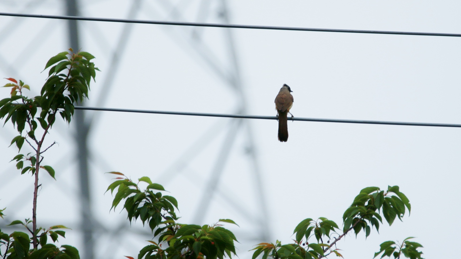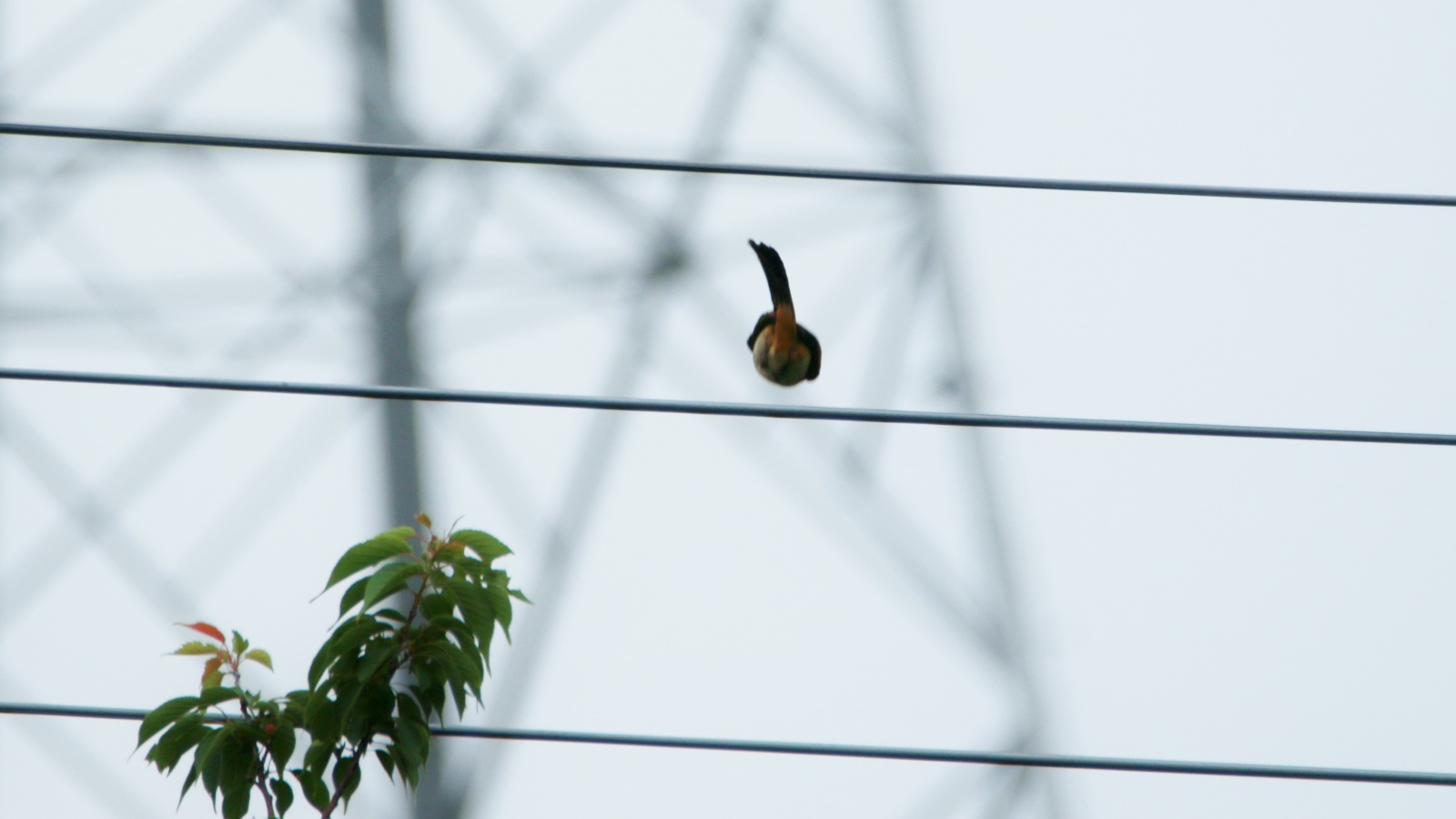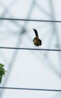 暫らくするとだいぶ遠くの電線に止まっていました!~(笑) 今朝の成果は無いなんて思いながらの撤退でしたが駐車場に着く寸前にかなり遠くに(100m以上も下流に)昨日のカルガモが親に引率されながら泳いでいました~♪ 昨日と違って多分”両親の見守る中”