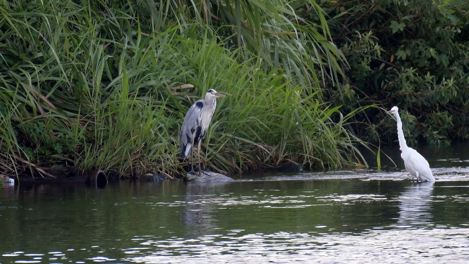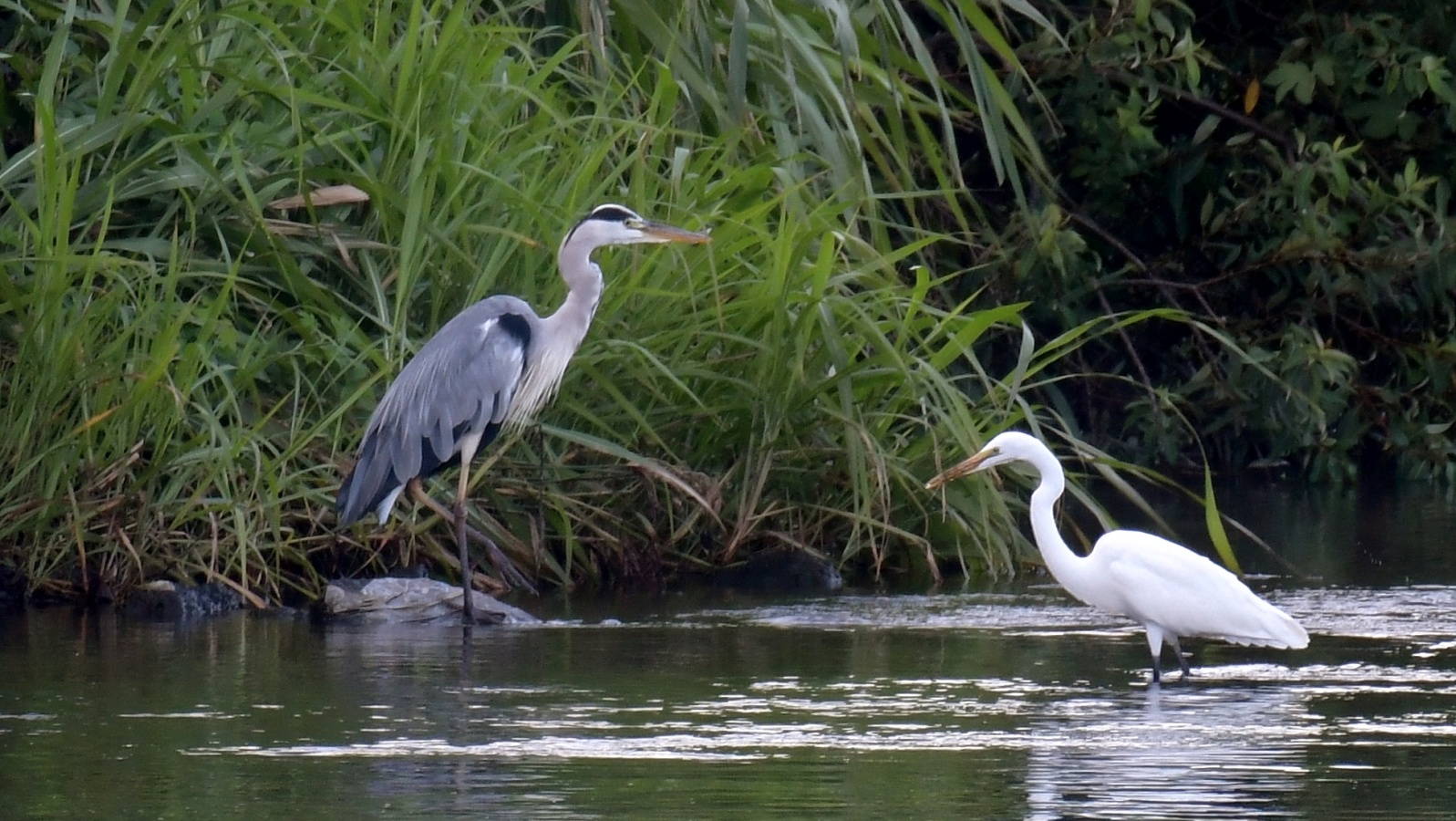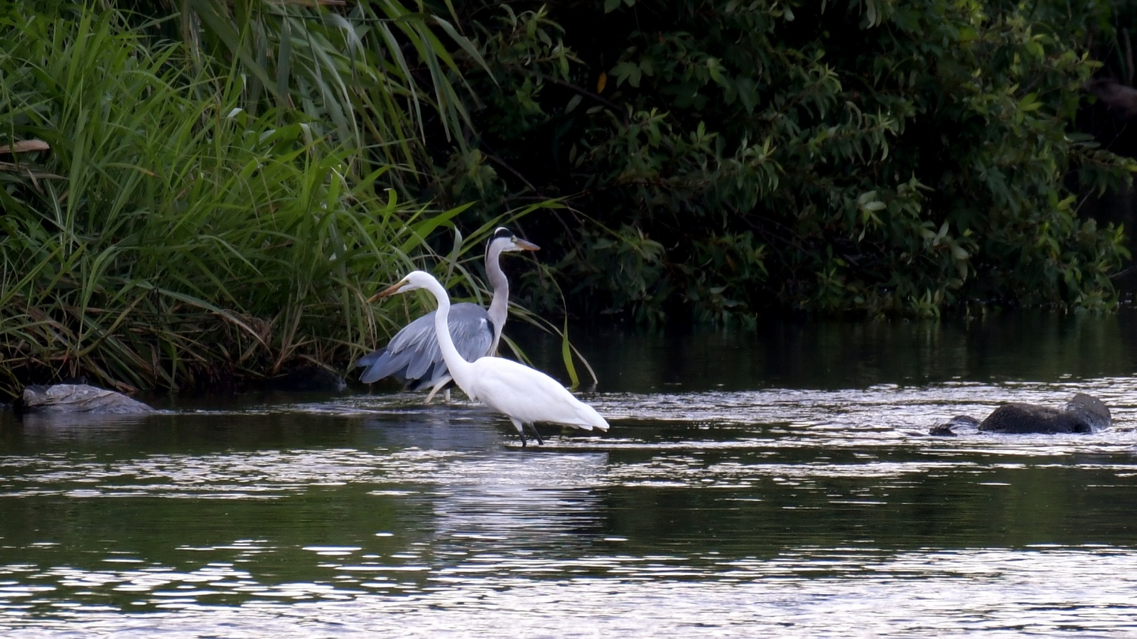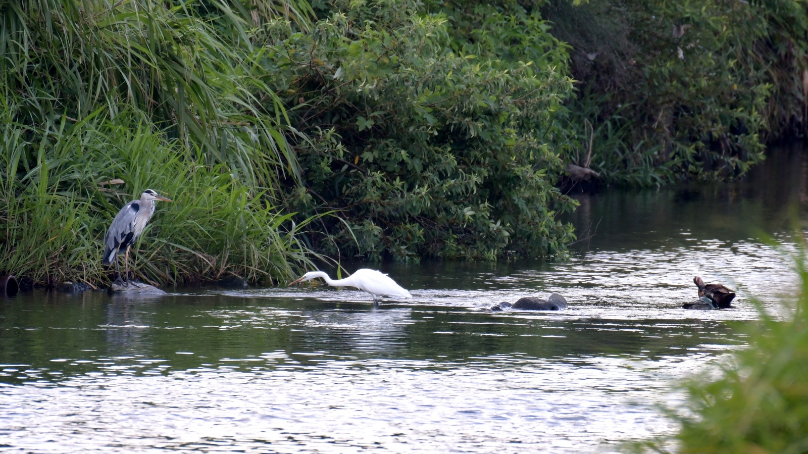 ◎ダイサギとアオサギの縄張り争い……すごすごとなにも無かったかのように去って行くアオサギ~(笑)
