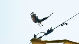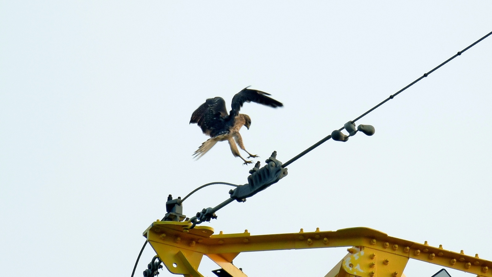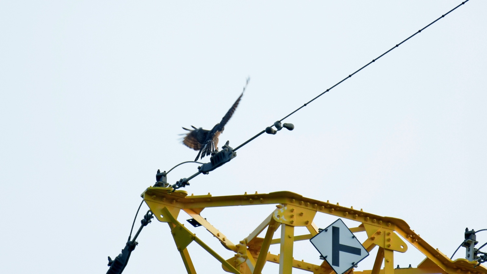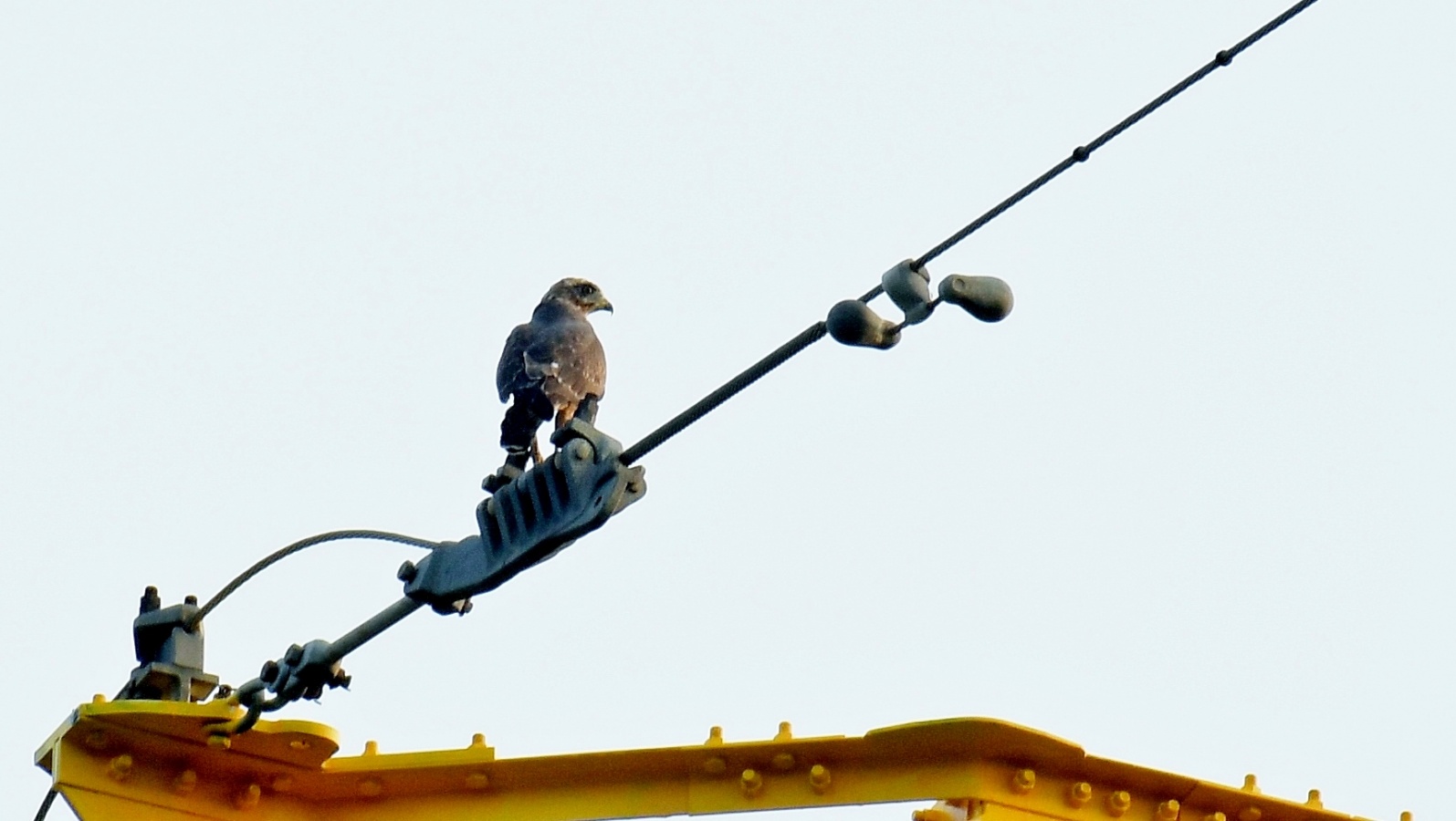 昨日の早朝は綺麗に晴れてその割に涼しく小鳥達の声も久しぶりに賑やかだったのおですがオオタカの若が公園の送電線の天辺に現れ、