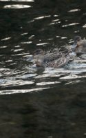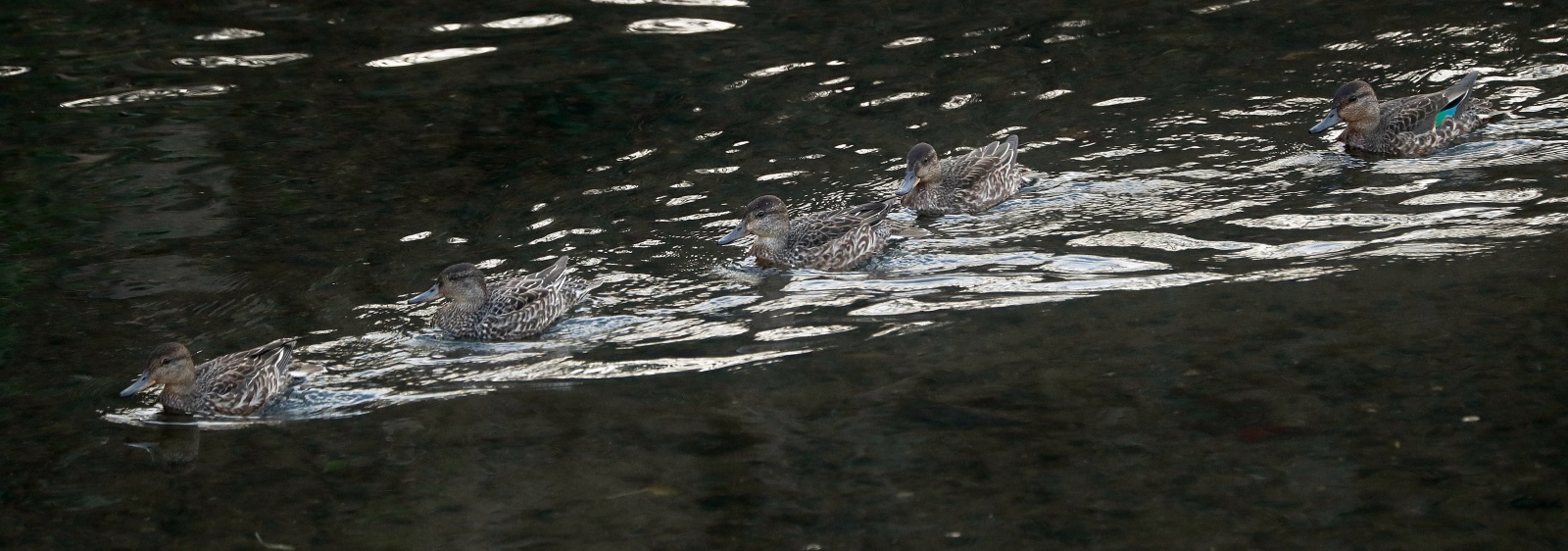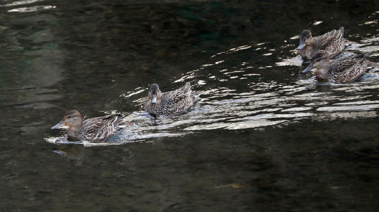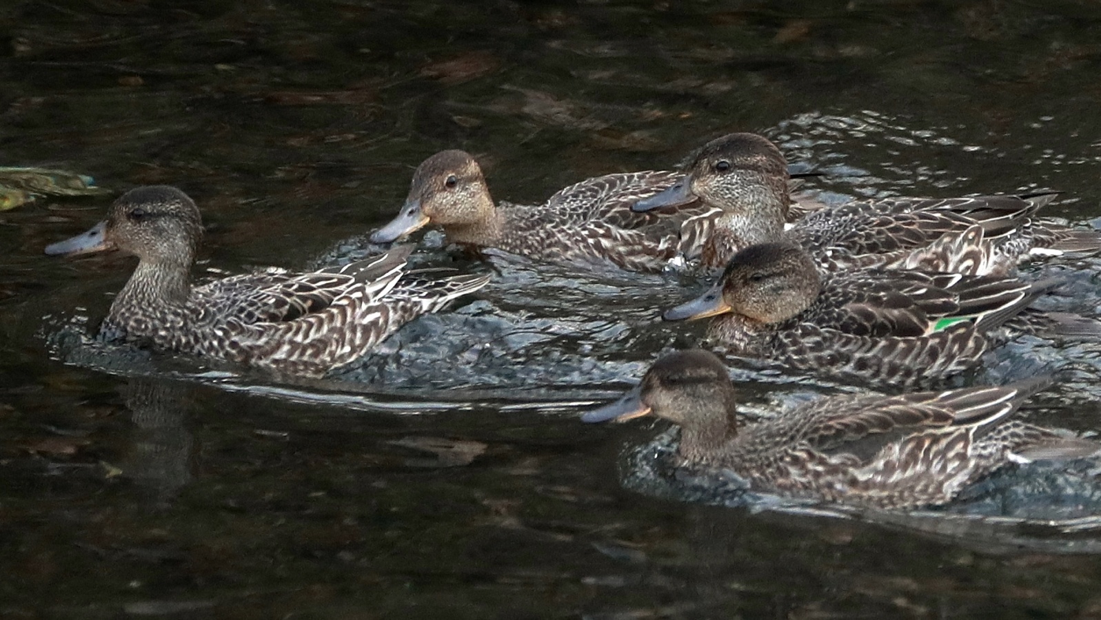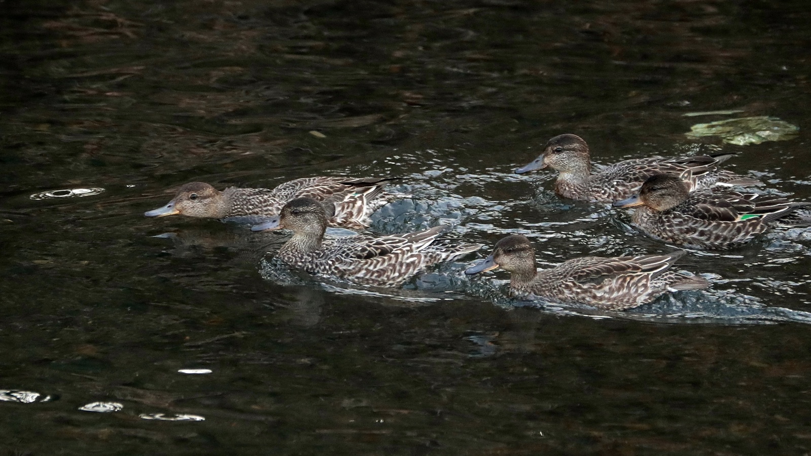 2週間位前に来ていた1羽のコガモの先導だったのか?親水公園の川にやっとやってきた、まだ♂♀の区別が付かないコガモ達です。