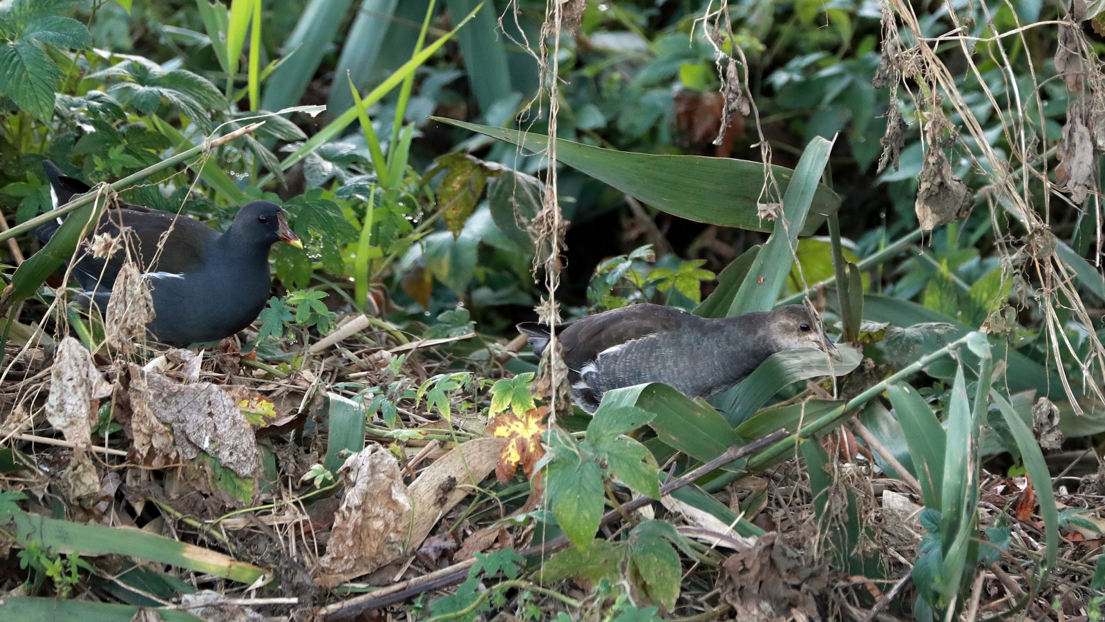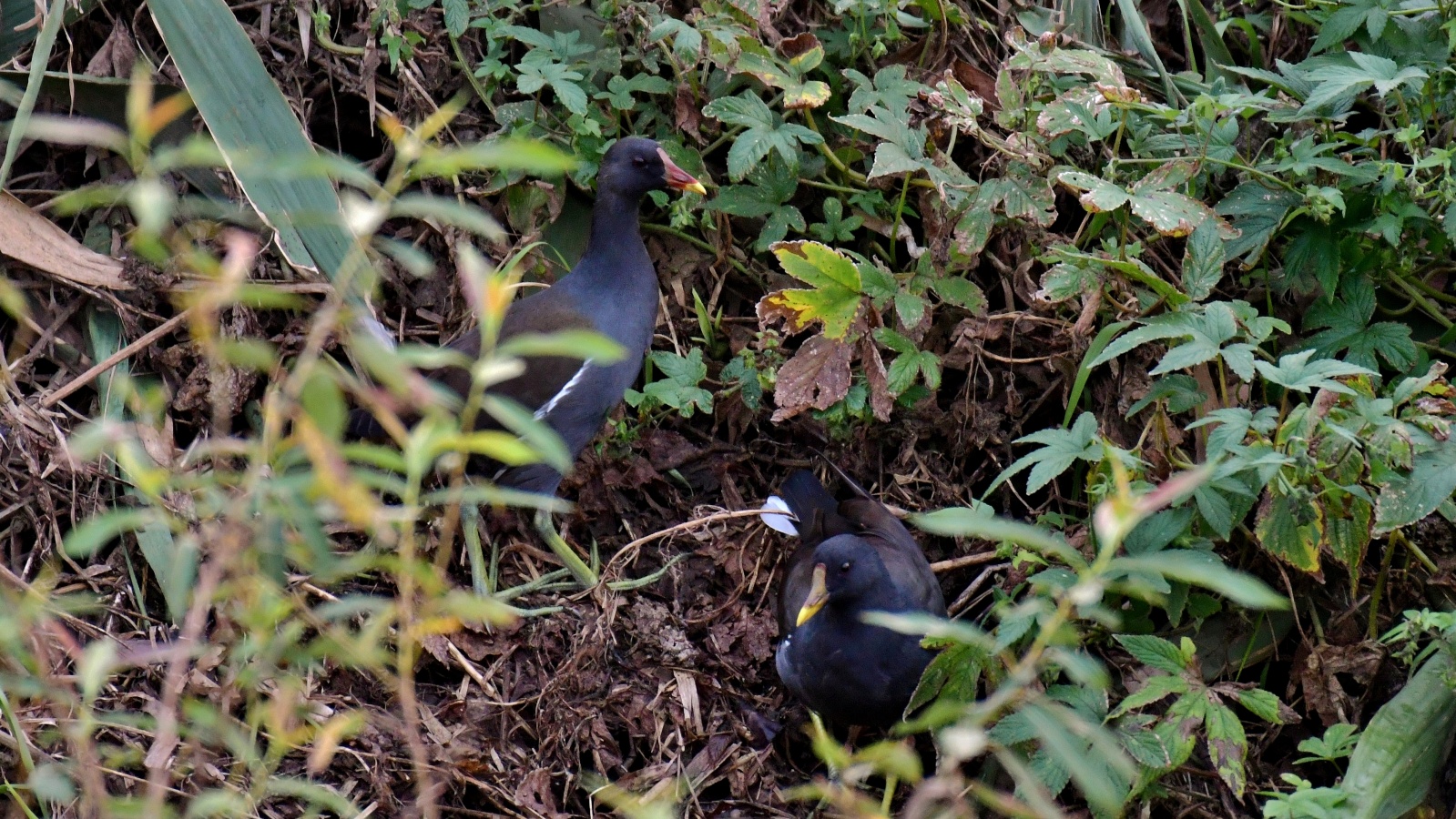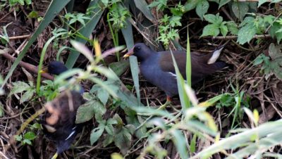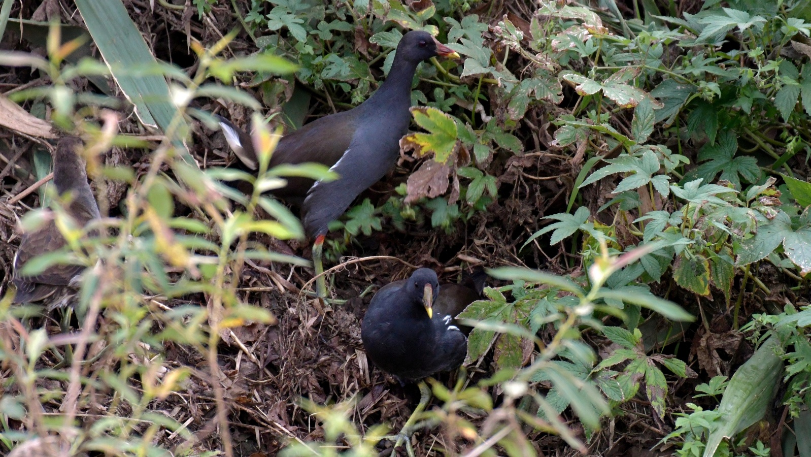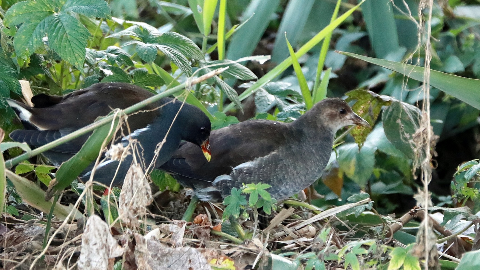 。 先日、公園の川の淵で撮ったバンの親子様子を…幼鳥は判るけど嘴が赤くなくて少し多きいのが♂?なのかなぁ~~