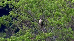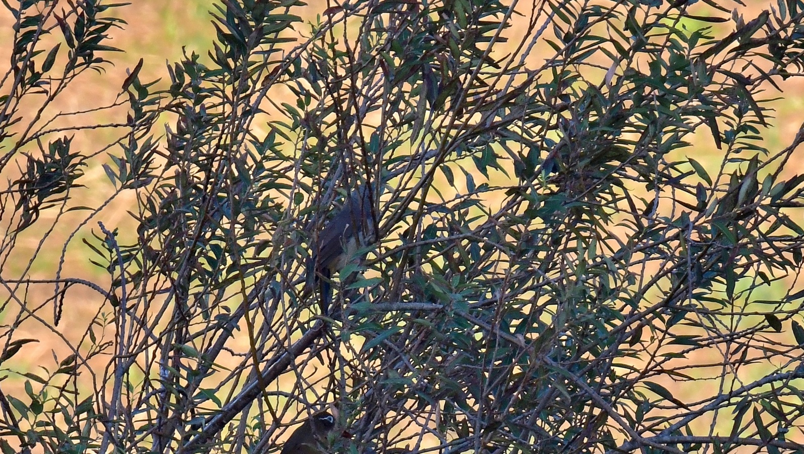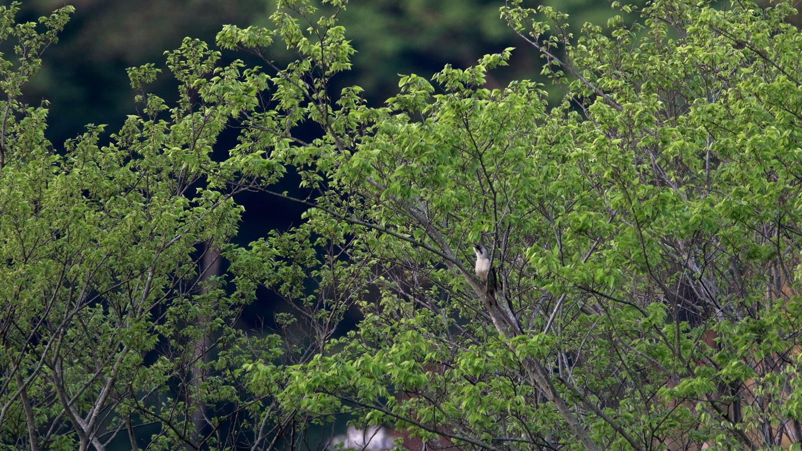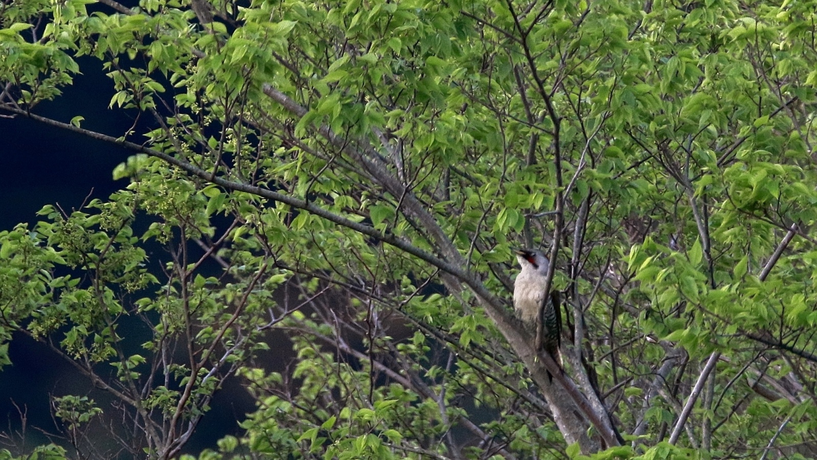 早朝だけはかなり寒かった今朝……予報では24℃になると言っていたので上着を着ないで自宅を出たら意外と寒くかったので又戻って薄手のダウンを着てきて正解でした。~(笑) 夢眠の散歩を終える頃から更に冷え込み早朝鳥撮りの時には少し手がかじかむほどでした。     今朝もガングロ君の声が聞こえてても下のほうで移動している様で諦めていましたが……又、撤退間際に木の上に止まってはくれました。 ・……でもだいぶ遠くの木の小枝の間で!やっと判別が出来る程度の証拠写真です。  ついでにコレも~在庫でボツにしようと思った遠くのアオゲラも!
