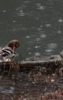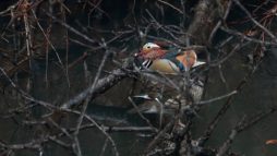 雨の中で待つこと30分以上!(…って言っても屋根のある野鳥観察小屋の中”) 仲良くカップルで休憩していたオシドリ君、有り難い事に近くに来たマガモのせいか居心地が悪くなったのでしょう~
