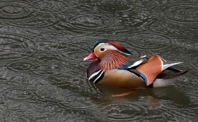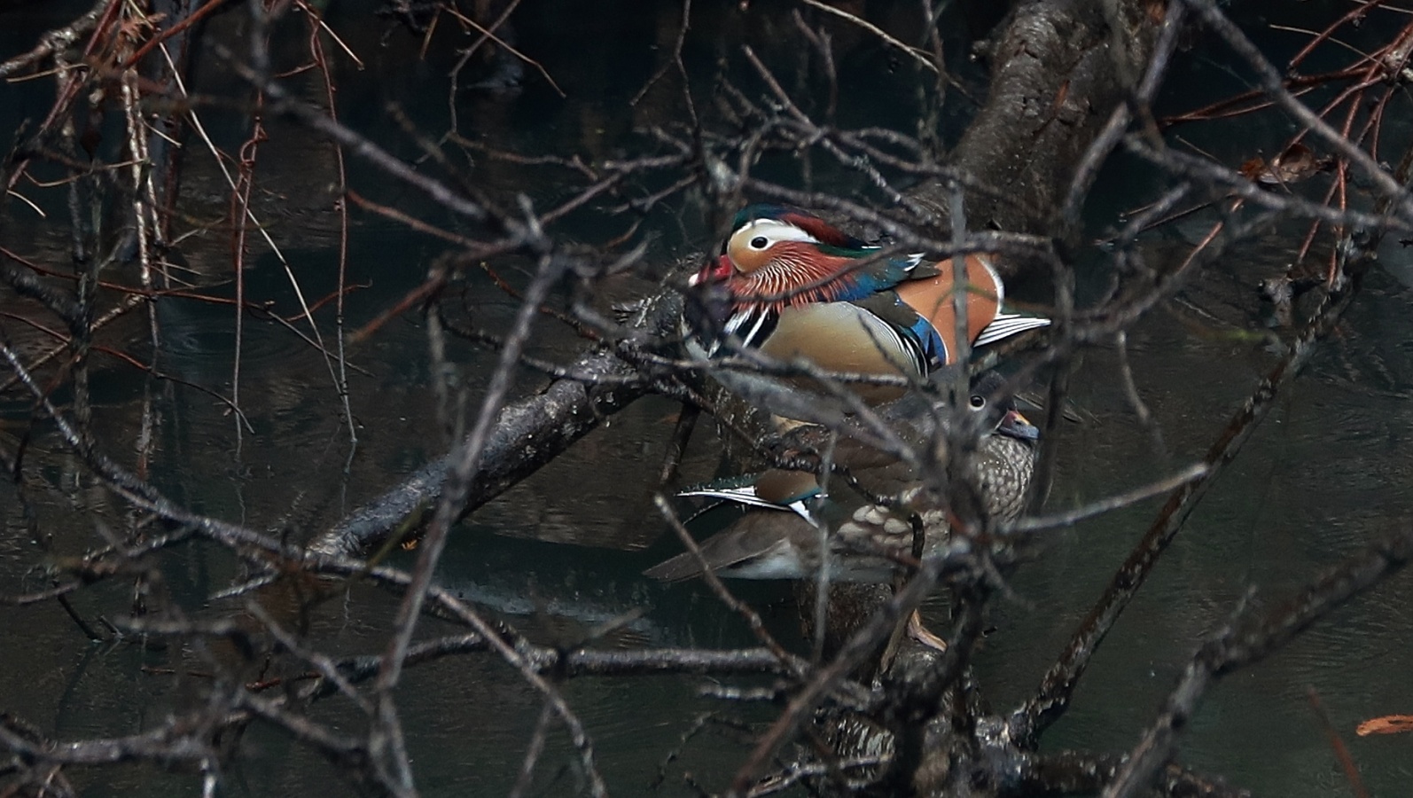 公園の池をじっくりとくまなく観察、やっと見つけたオシドリも雨のせいか水面の枯れ枝に留まったきりで全然動いてくれる様子も無く、半分諦めながらも