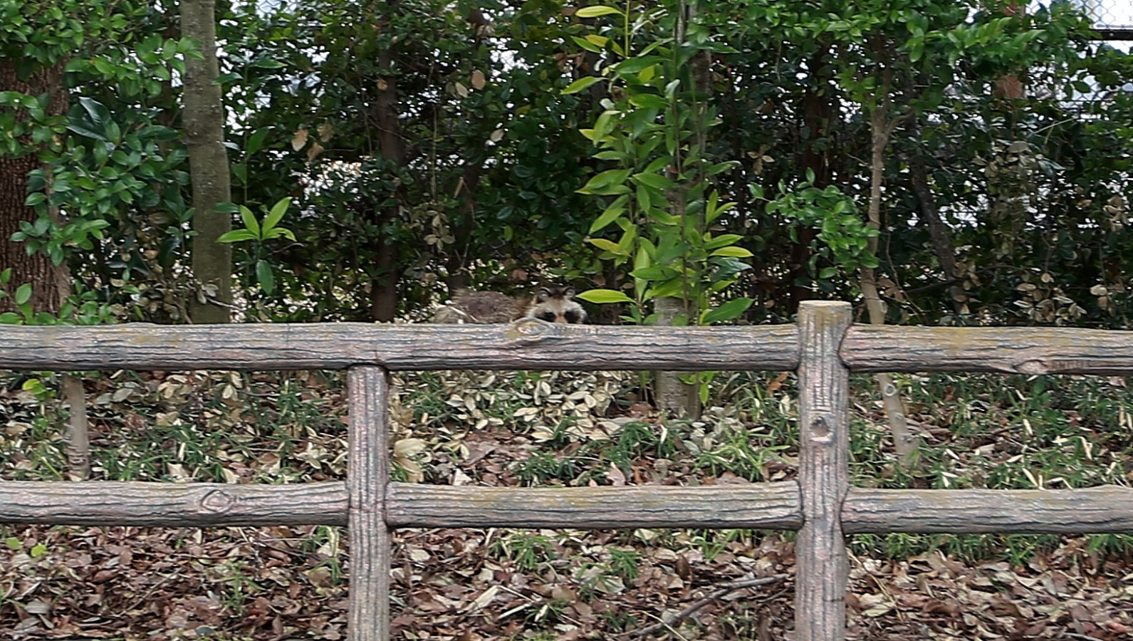 ◎ 今朝は雨だったし、早朝の仕事もあり夢眠の散歩は自宅待機で午後2時過ぎに迎えに行きました。 鎌倉市は雨が降っていましたが藤沢の自宅付近はどんよりとした空で公園での散歩も出来ました。 この天気のせいで公園の人出も少なくのんびりと歩いてきました。 帰り道の途中で…★あれ”猫かな?と思ってよく見たら6~7mしか離れていない植え込みの蔭にタヌキです! 散歩用のカメラ…フルサイズに16~35mmでは遠すぎて~(笑)