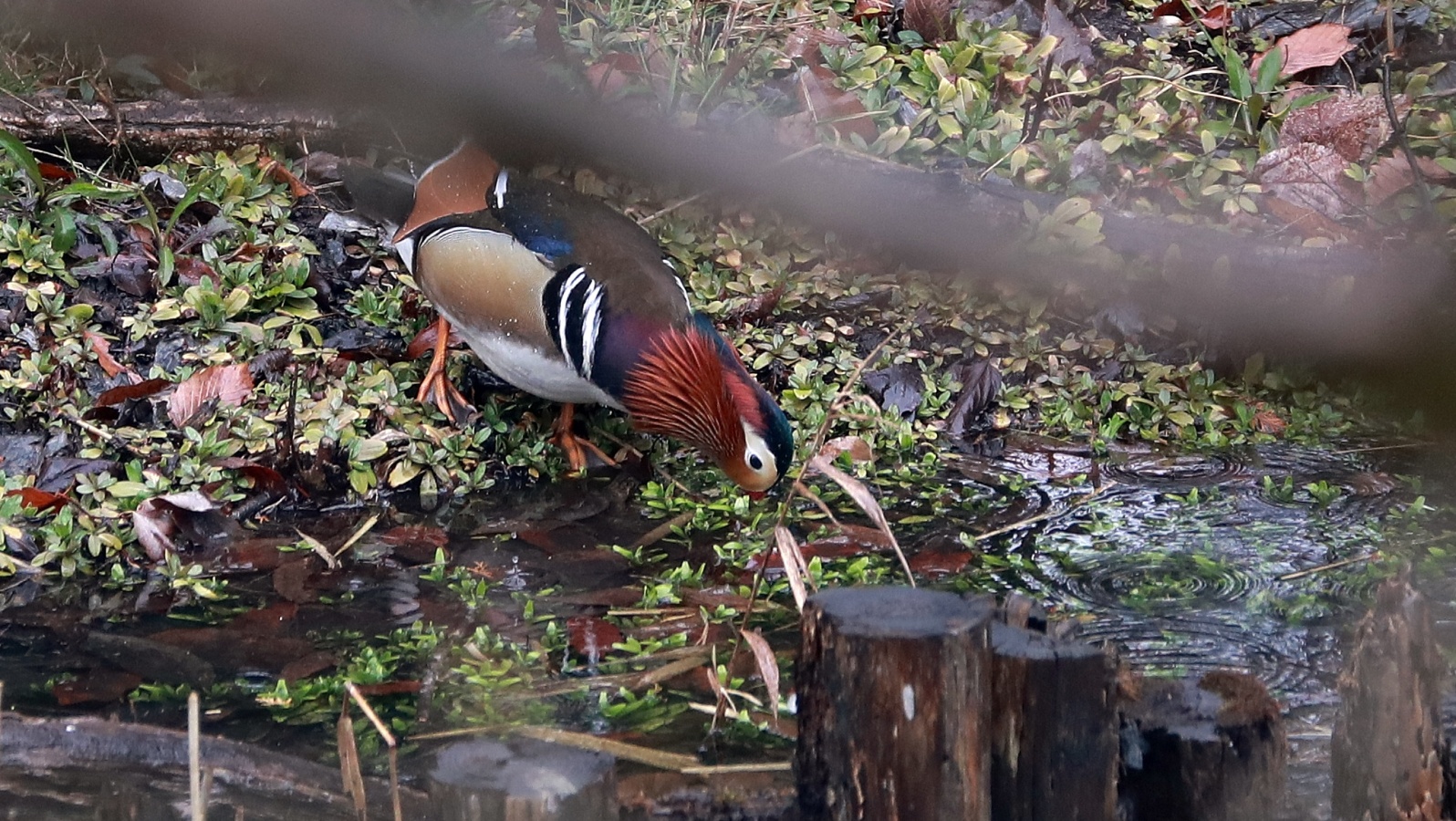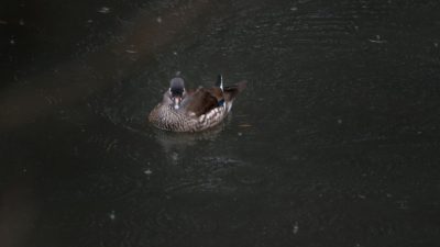 公園の池をじっくりとくまなく観察、やっと見つけたオシドリも雨のせいか水面の枯れ枝に留まったきりで全然動いてくれる様子も無く、半分諦めながらも