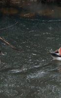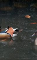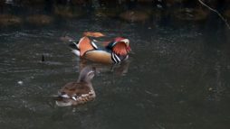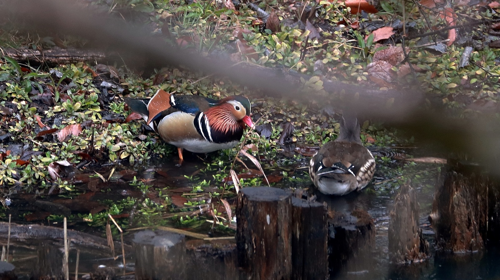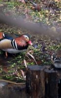 雨の中で待つこと30分以上!(…って言っても屋根のある野鳥観察小屋の中”) 仲良くカップルで休憩していたオシドリ君、有り難い事に近くに来たマガモのせいか居心地が悪くなったのでしょう~