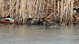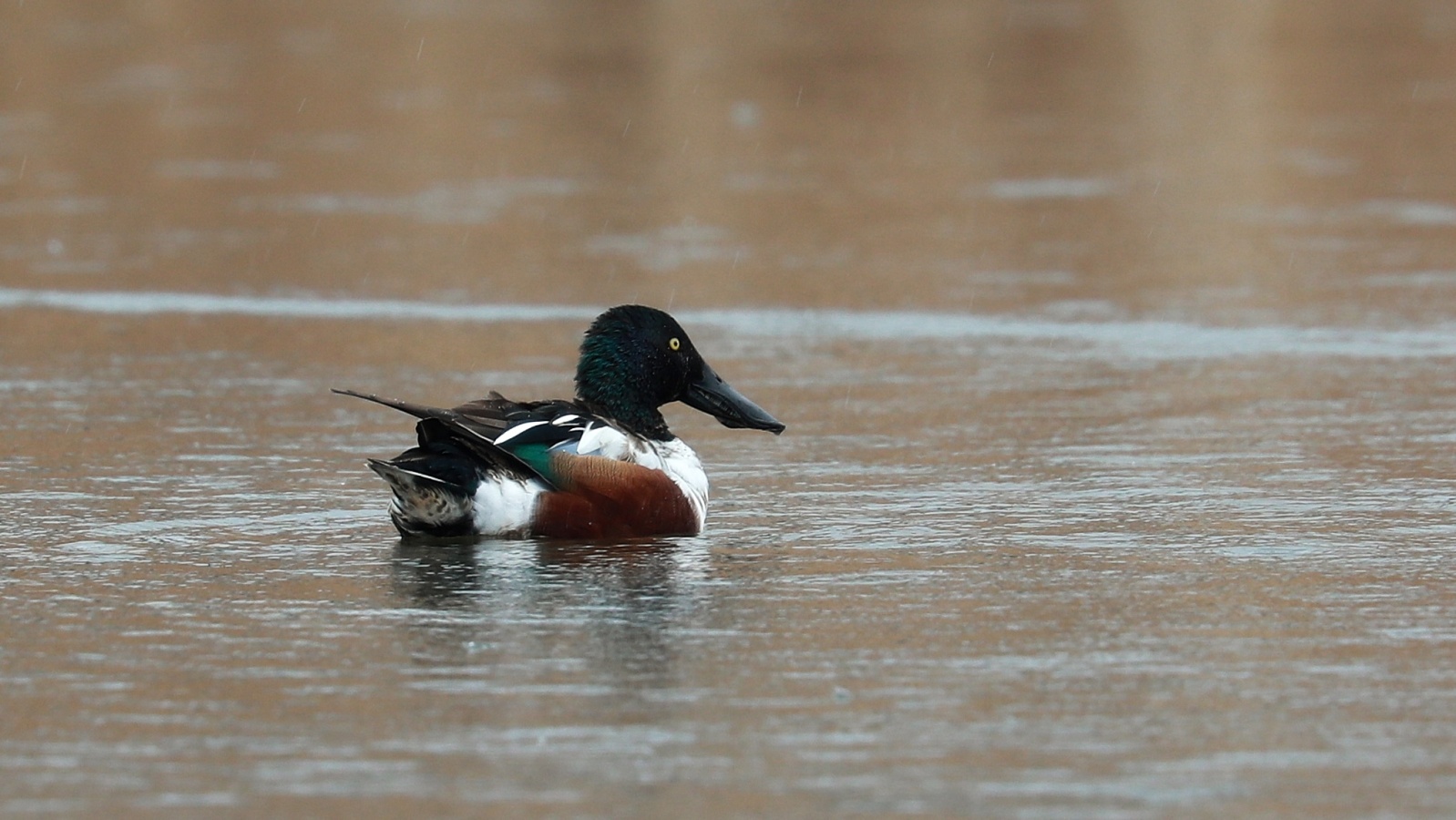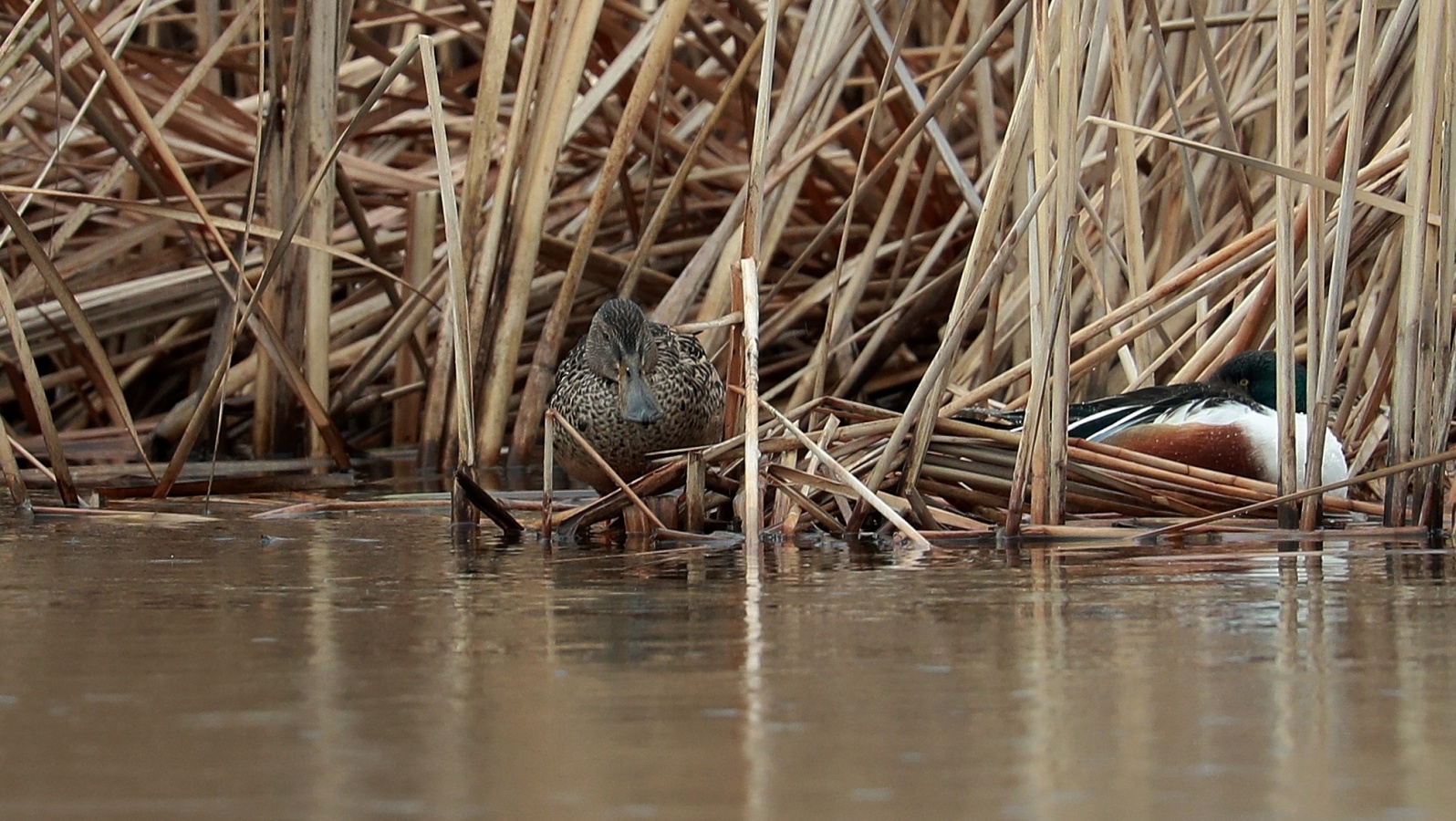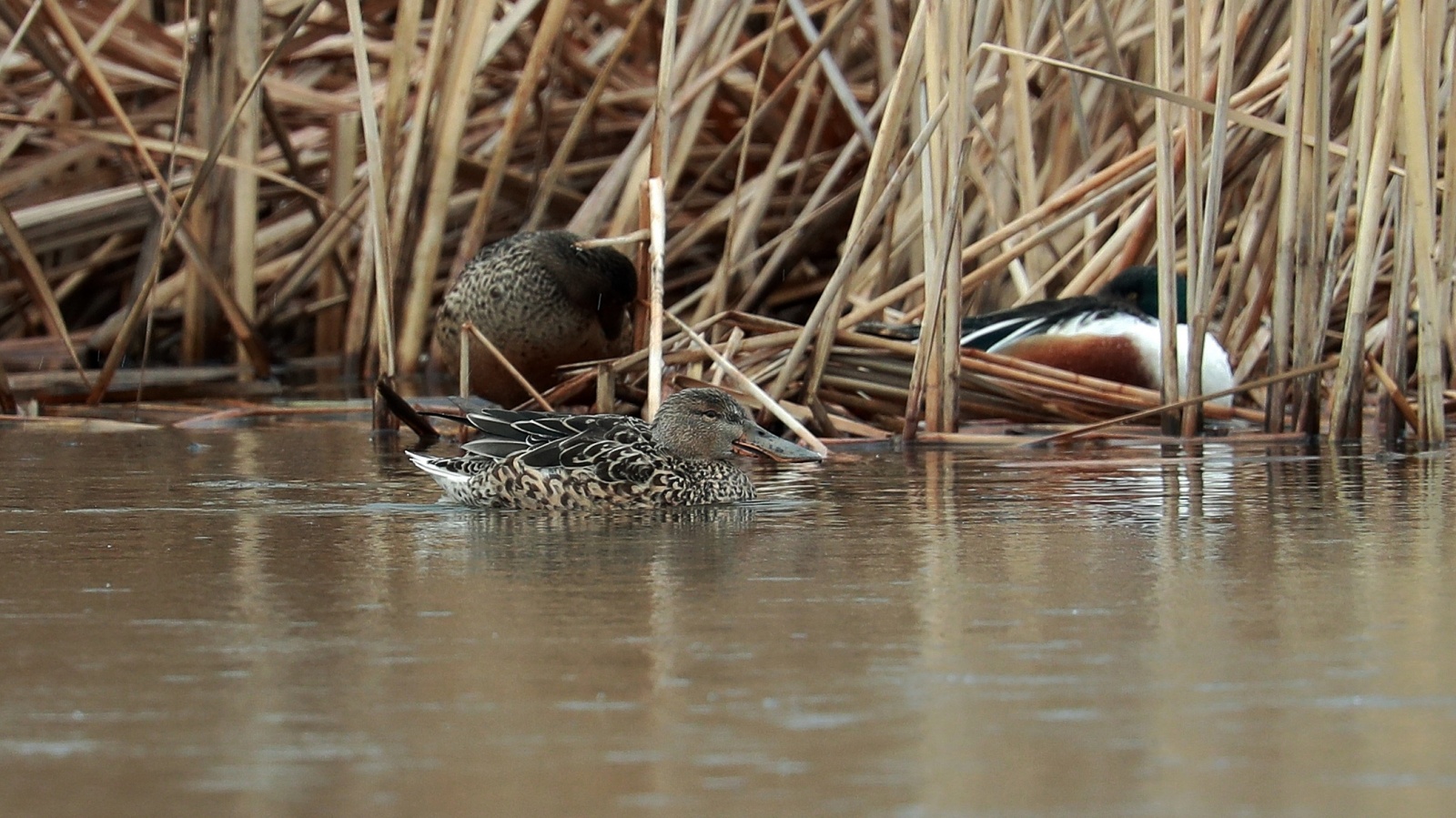 ◎ 一昨日の風雨の中での鳥撮り~。 カモさん類を(ハシビロガモ・オカヨシガモ・ヒドリガモ・コガモ)……かなり遠いので羽毛の繊細さまでは撮れませんが……。