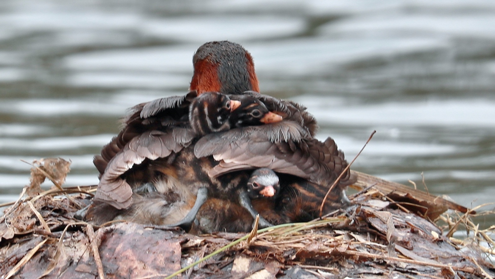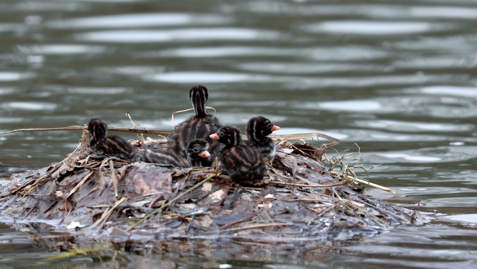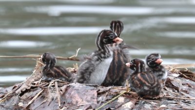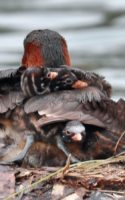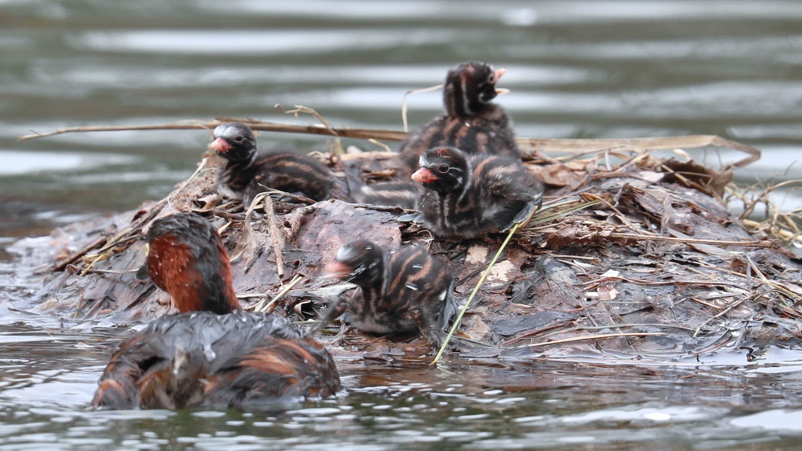 2倍テレコンを付けて可愛いカイツブリの雛の様子を~♪ 5羽の雛が元気良く育っていました。……