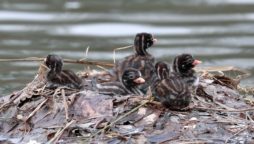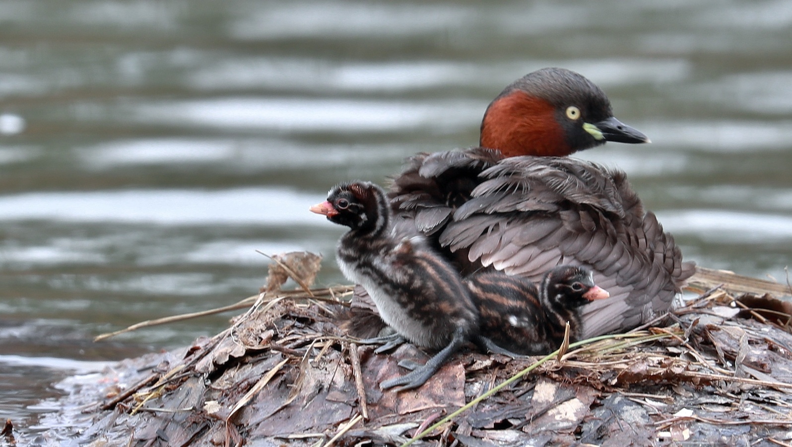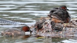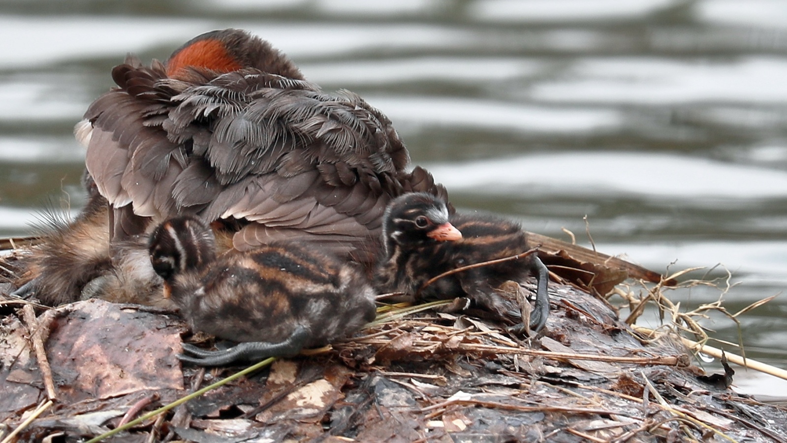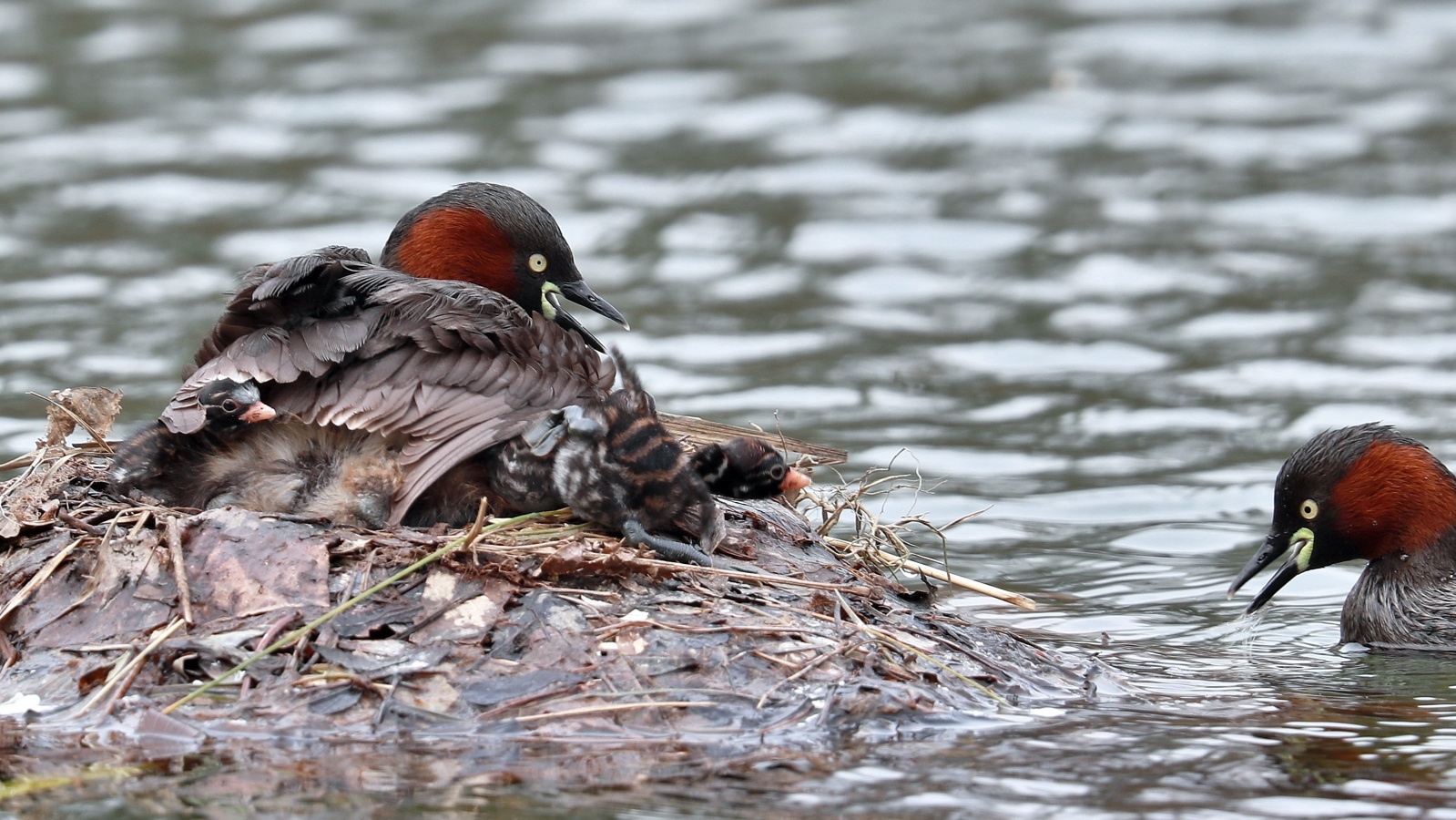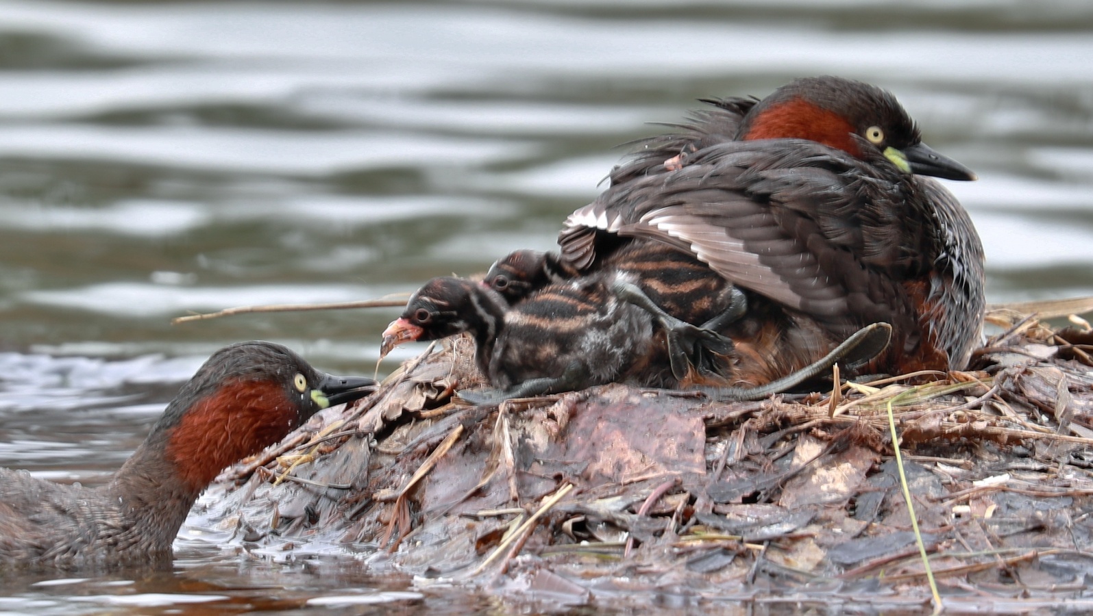 2倍テレコンを付けて可愛いカイツブリの雛の様子を~♪ 5羽の雛が元気良く育っていました。……