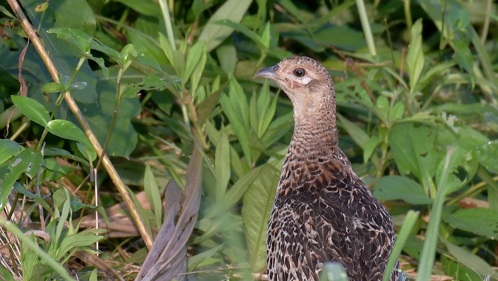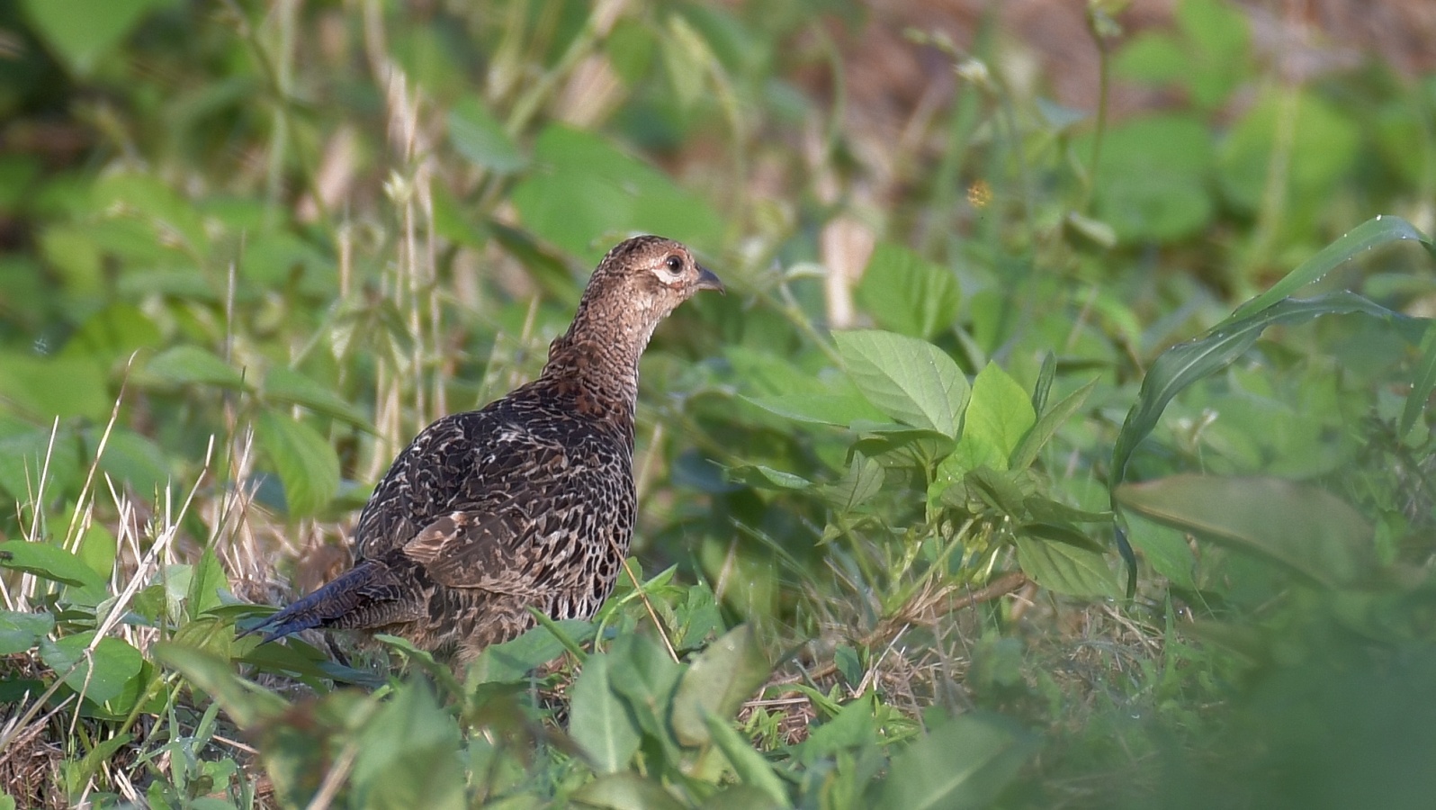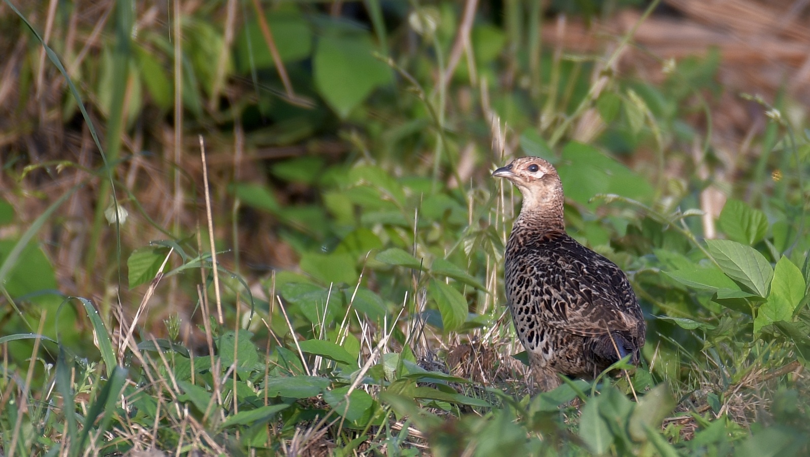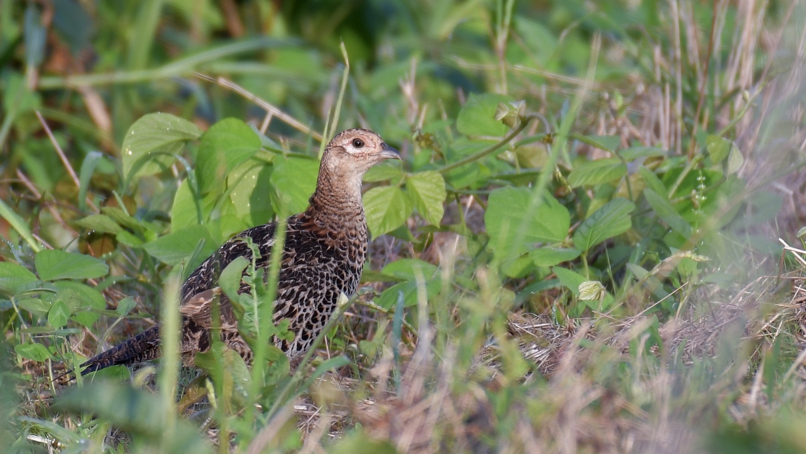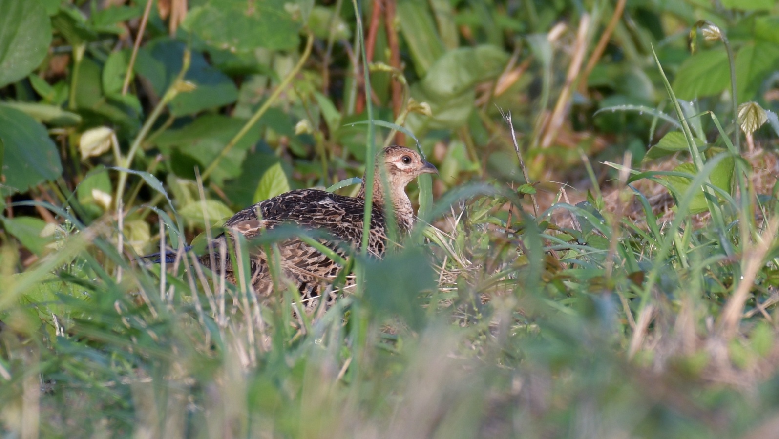 暑くて歩く気が起きず(笑)、湿原の木道のコースを少し歩いただけでしたが、遠くのコムクドリの群れを見つけ撮っていると直ぐ手前でキジの幼鳥?が出てくれました。若い雌♀のキジかなぁ~?