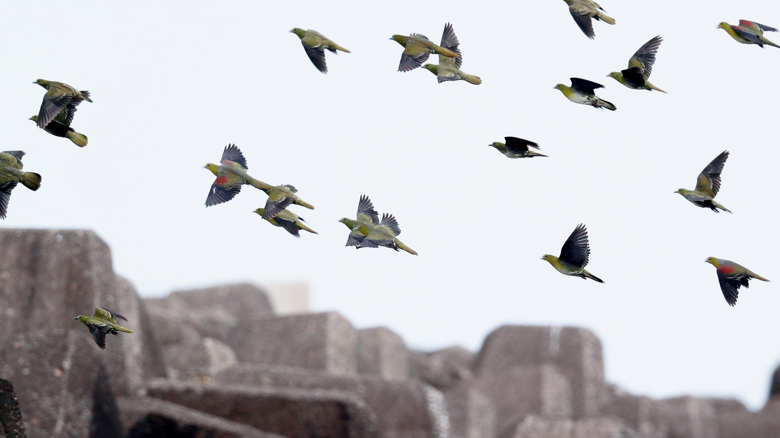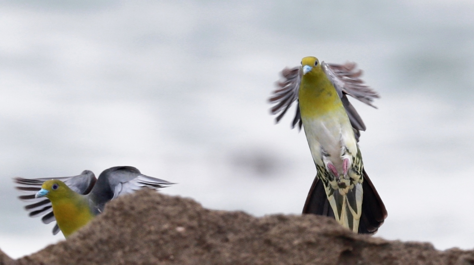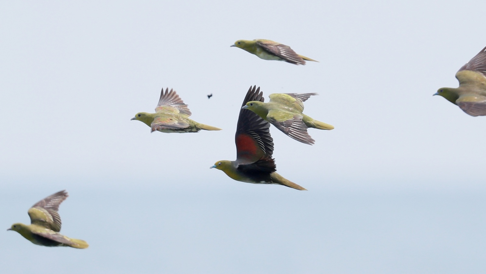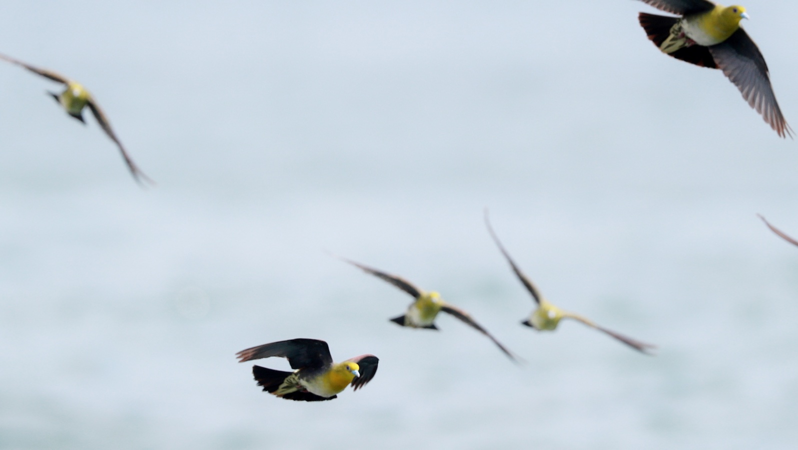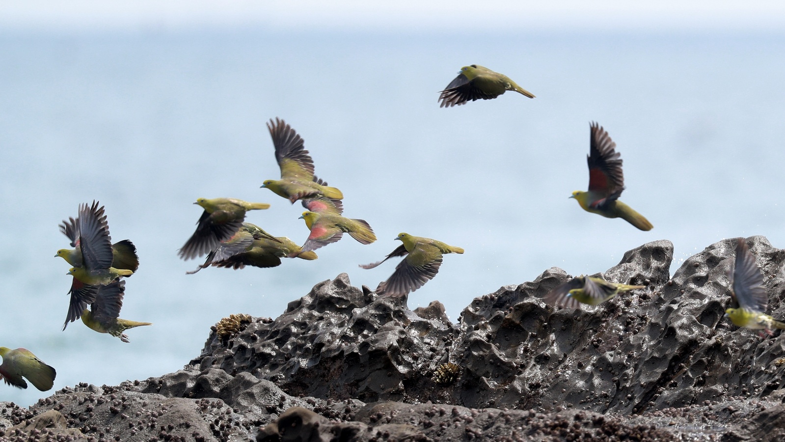 ★★大磯のアオバト~20分に一回位の感じで、大小さまざまな群れで飛んできます。 チョット”ハヤブサの来襲を期待はしていたのですが……いまだかってこの海岸でハヤブサの姿を見たことがありません!~(悔)