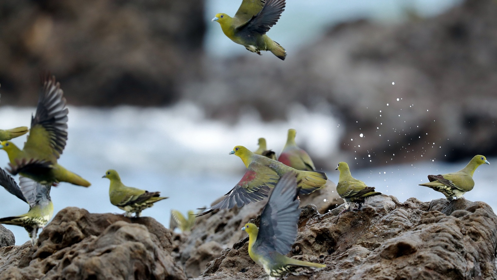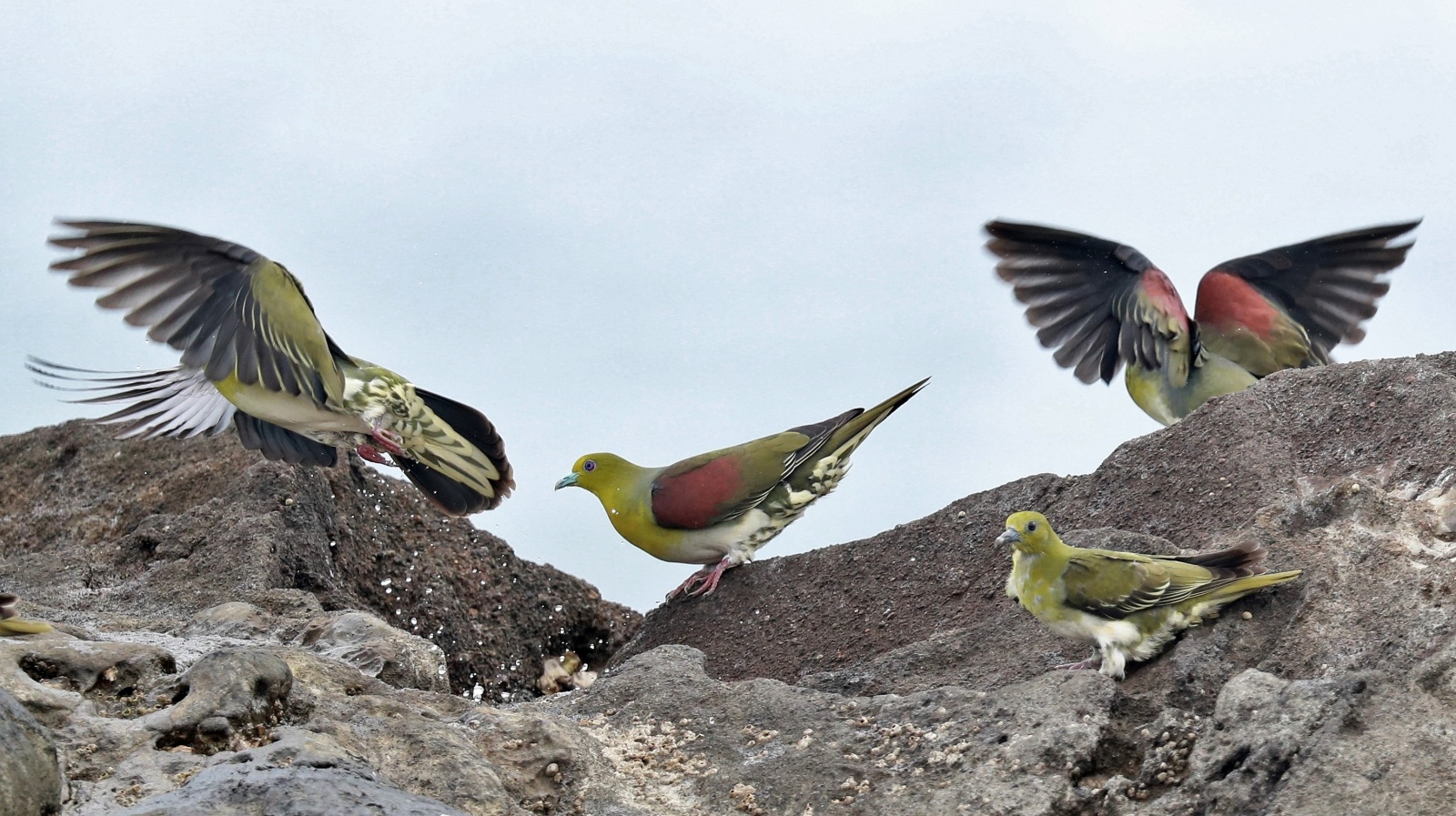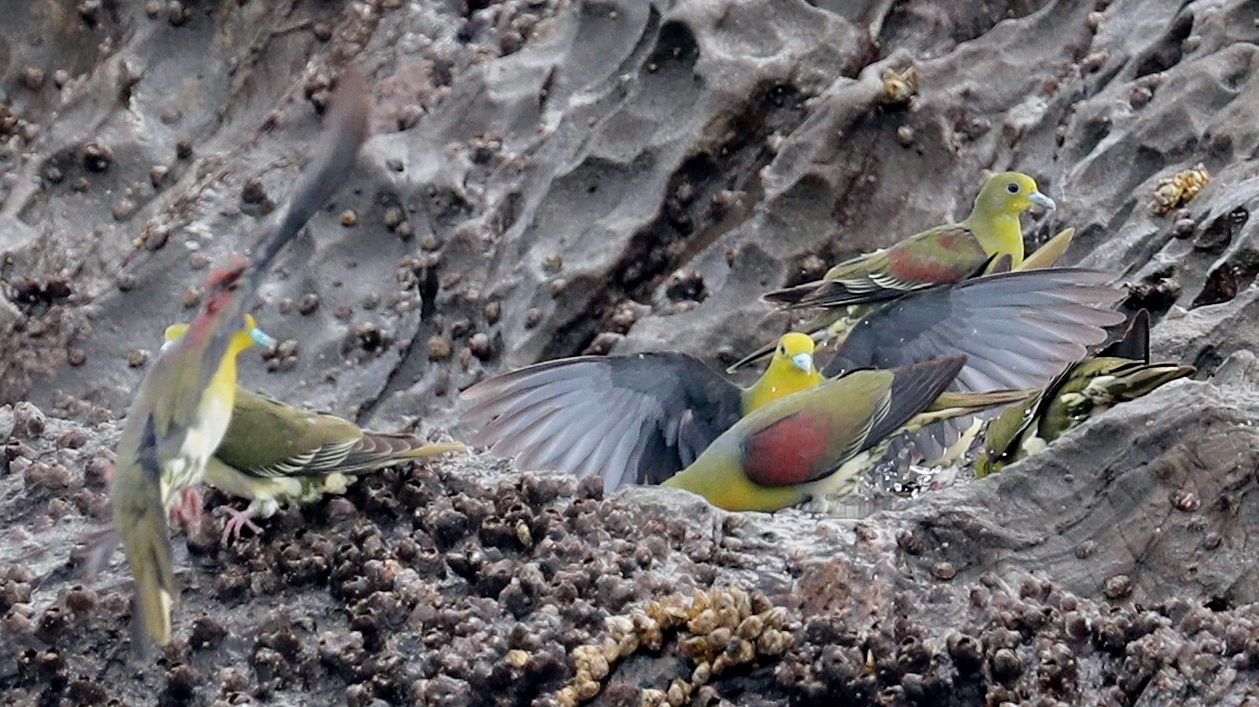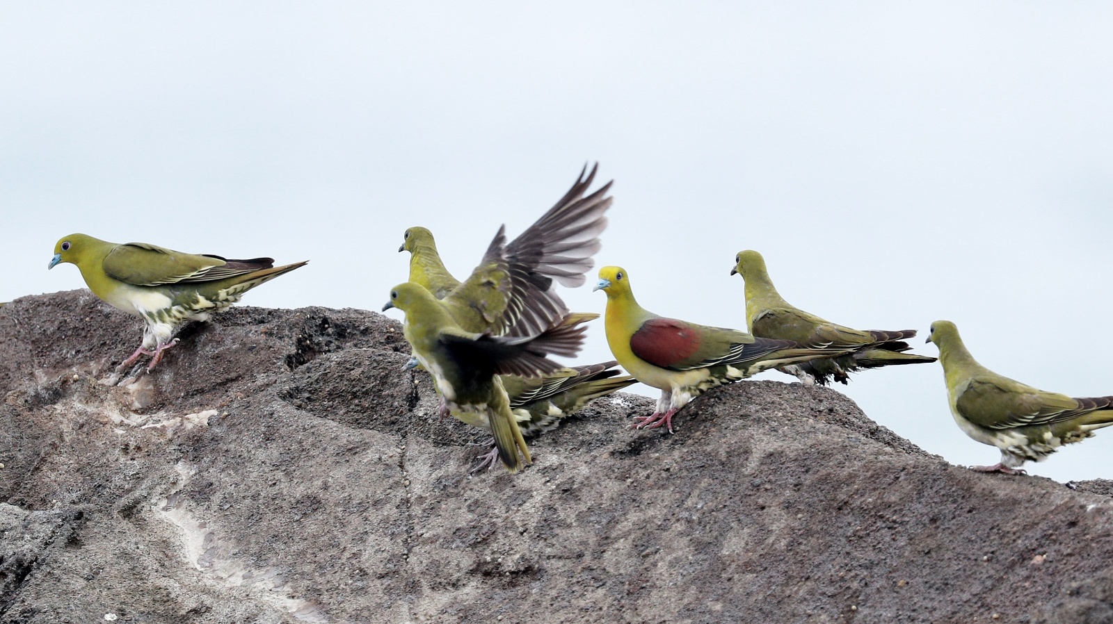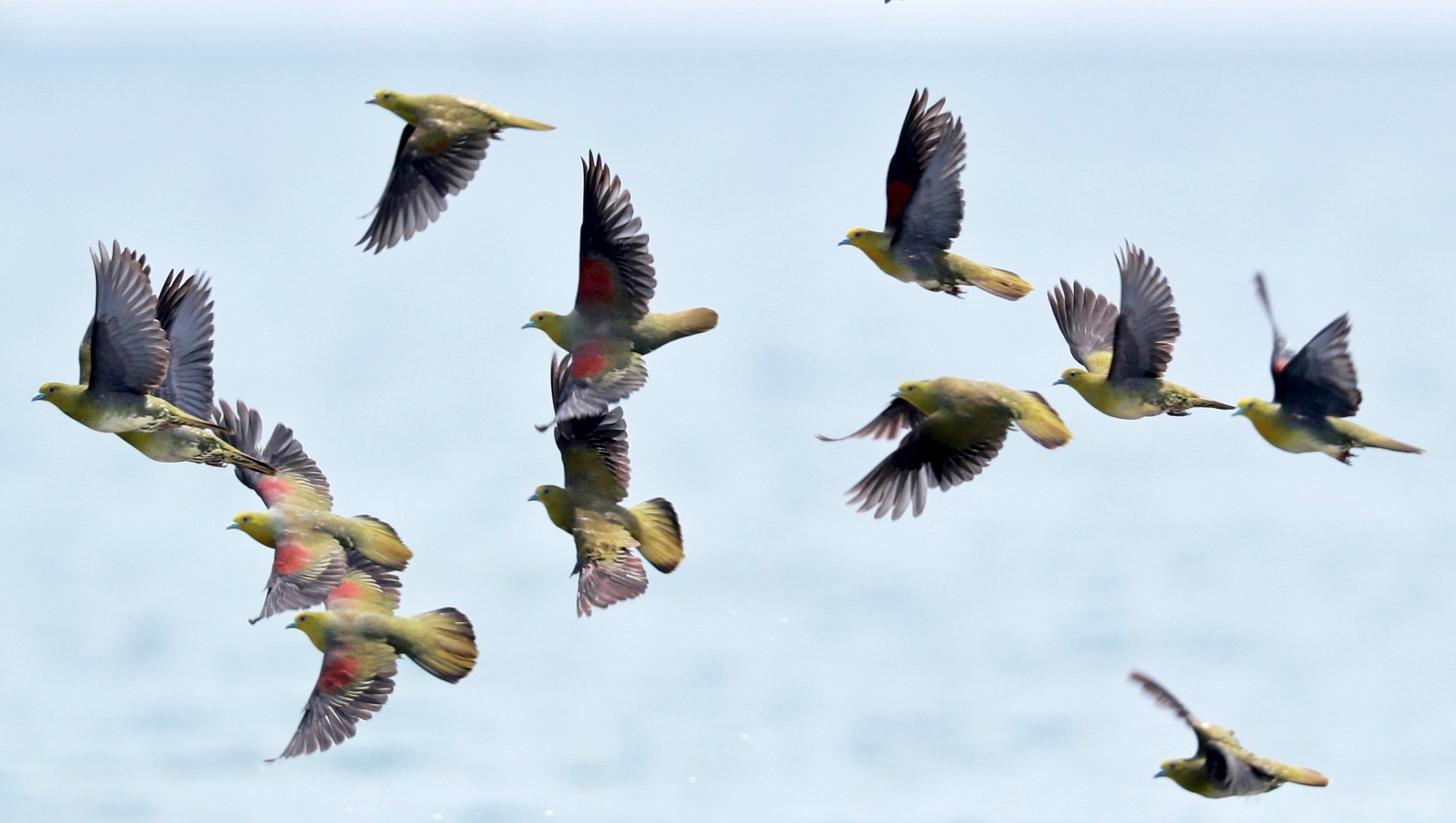 ★★大磯のアオバト~20分に一回位の感じで、大小さまざまな群れで飛んできます。 チョット”ハヤブサの来襲を期待はしていたのですが……いまだかってこの海岸でハヤブサの姿を見たことがありません!~(悔)