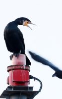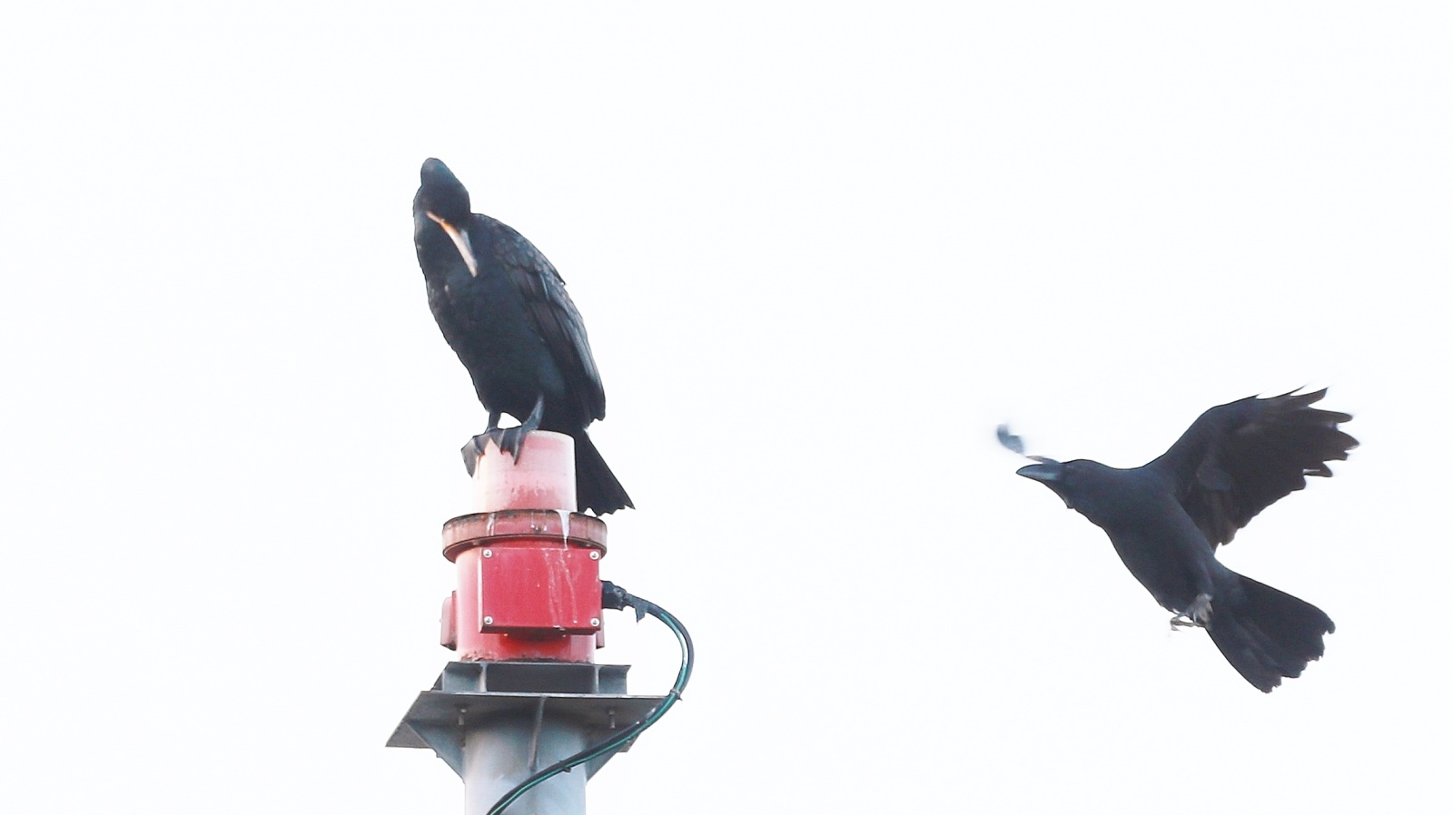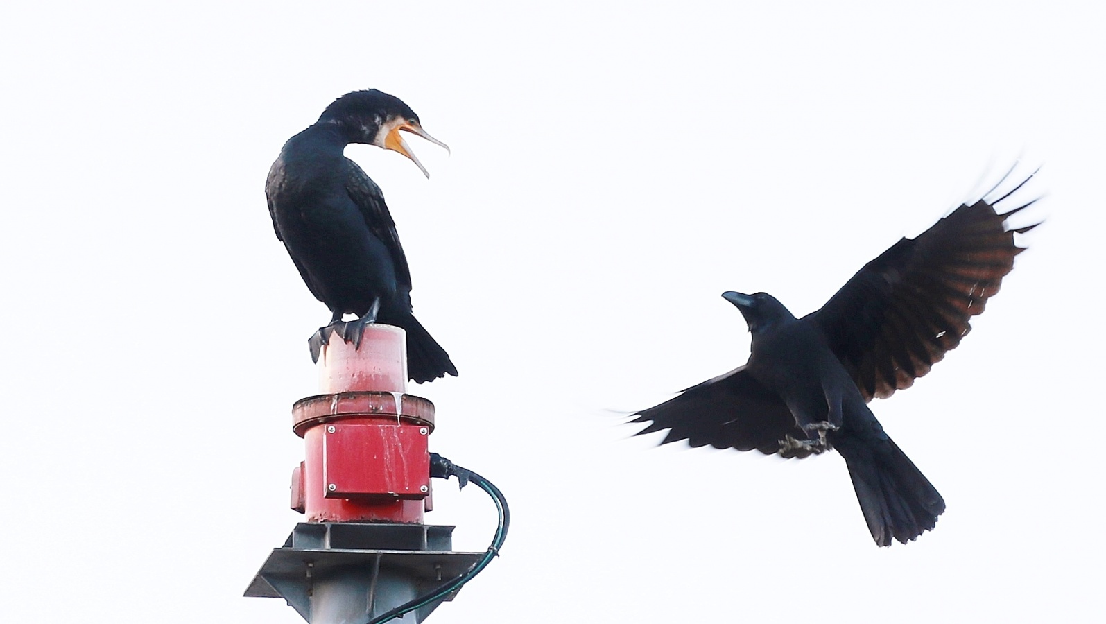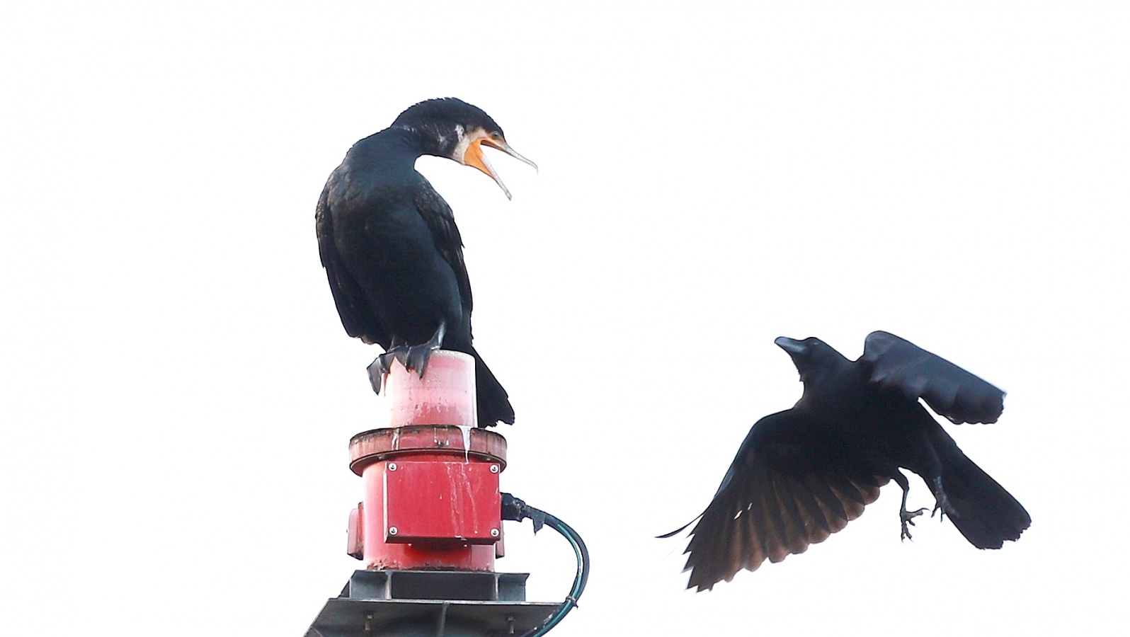 おまけ……羽を乾かし休憩している鵜にちょっかいを出すが~鵜の方が強そうで怒られ(笑)諦めて撤退したカラスくん!~(爆)