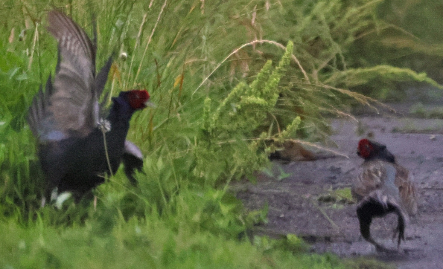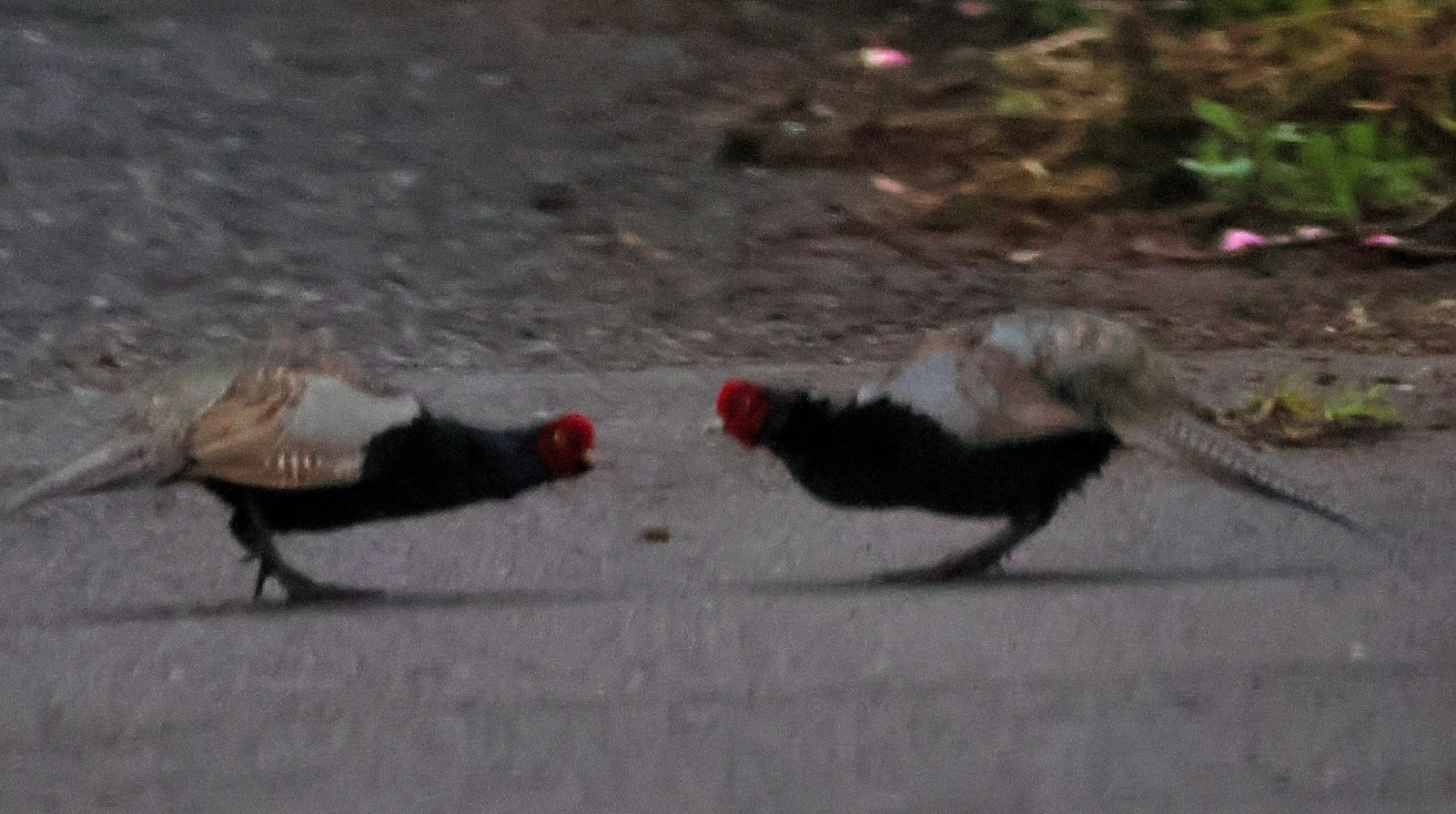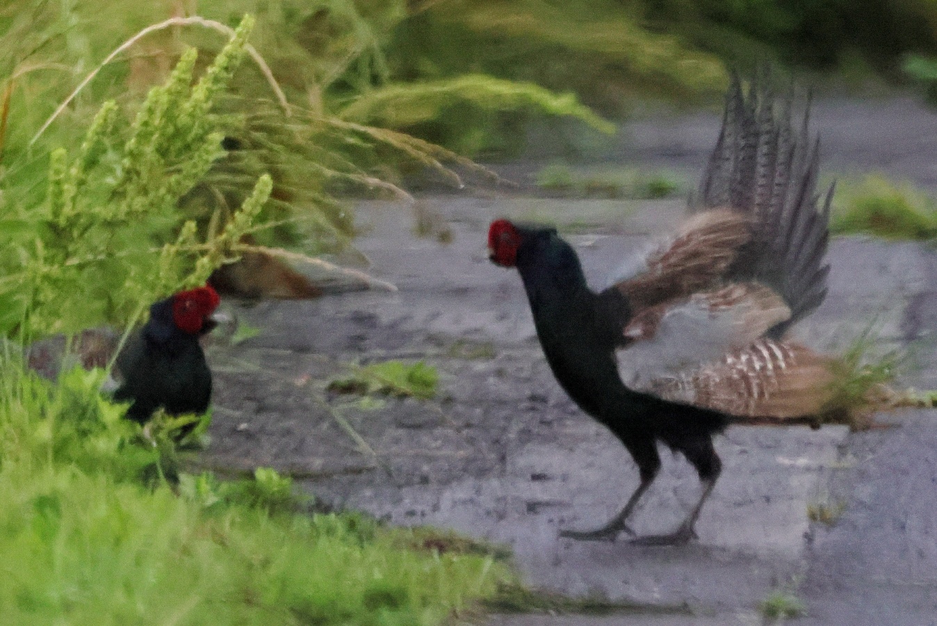 今朝は何時も居るキジの棲み処付近で2羽の♂のキジが縄張り争いか?バトルの最中でした。厚い雲に覆われ暗くてボケボケですが10分以上車の中から観察です!~♪