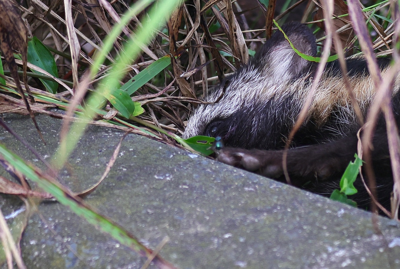 その中のまだ子供のハクビシンが車に轢かれててしまった様です。 駐車場の入り口の道路には