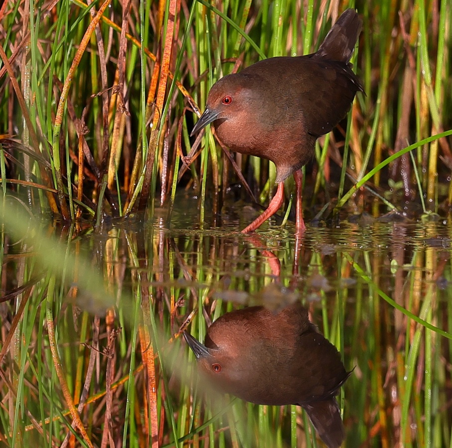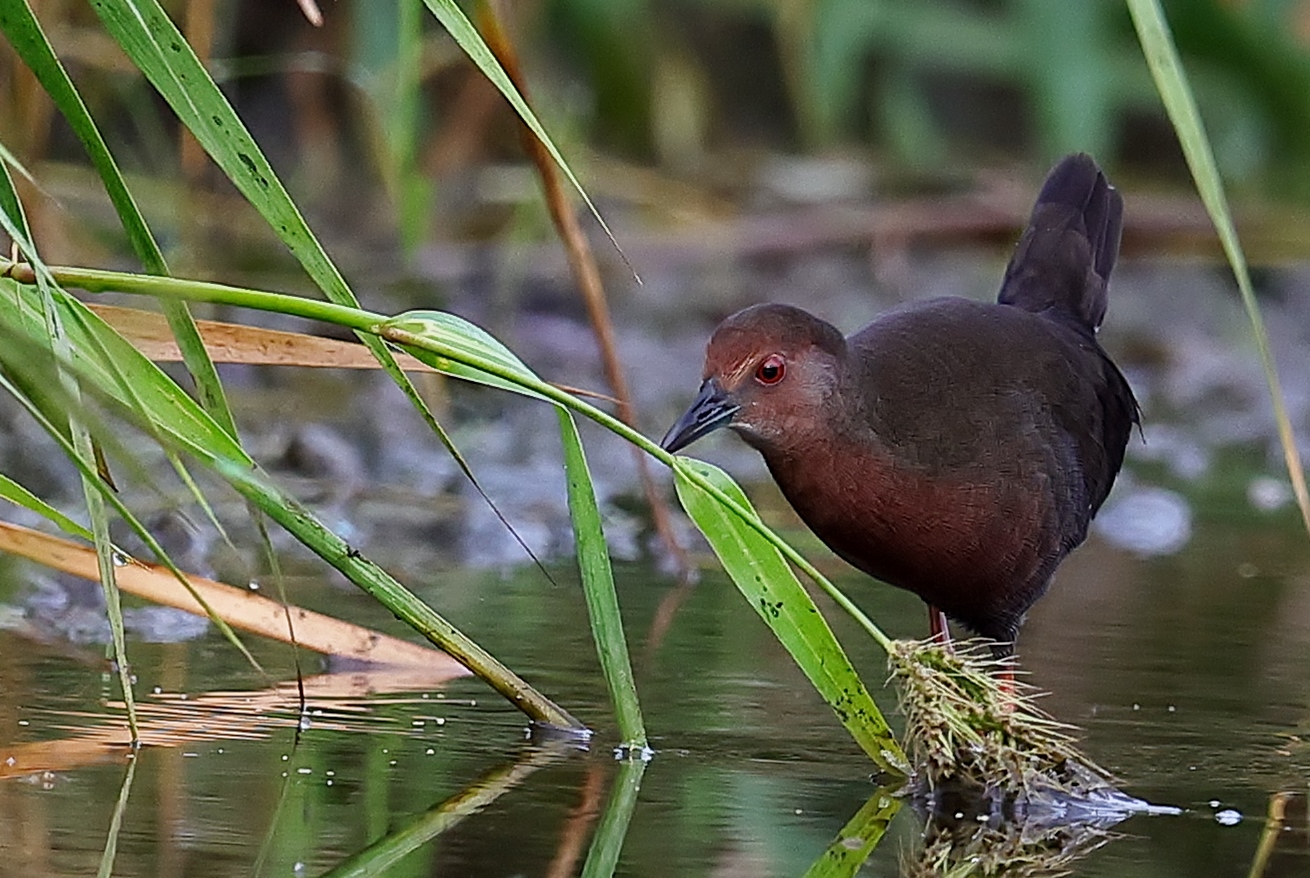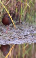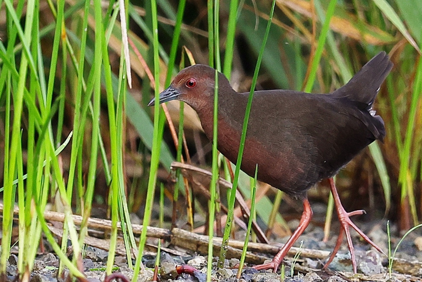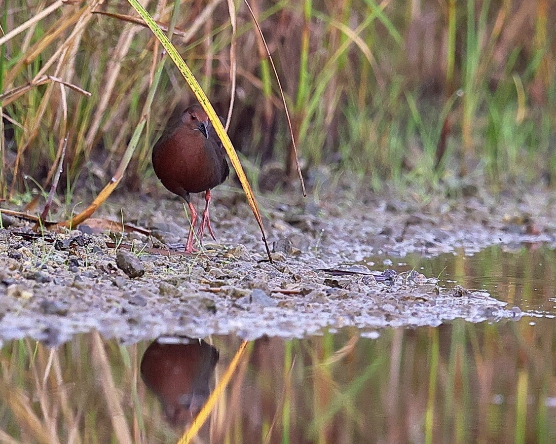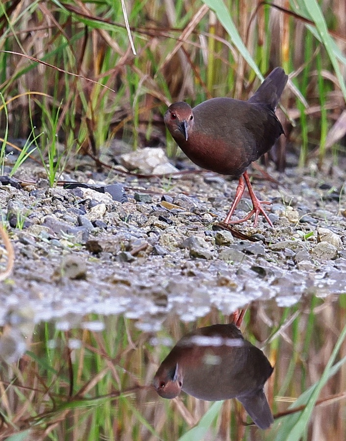 昨日の早朝の写真です。 最近2~3度見かけた場所で出てくれるのを待っていると、1時間位のうちに3回ほど現れてくれましたが、台風の影響か途中で大粒の雨が降るなどして急に暗くなったり明るくなったりと、カメラの設定があわただしい撮影でした!……(笑)   ヒクイナ君が気にならない位の距離を保ち~約80mから一番近づいてくれた40m位まで……なるべく動かずにじっと我慢です!(笑)