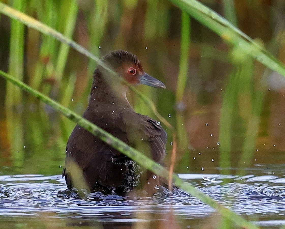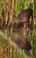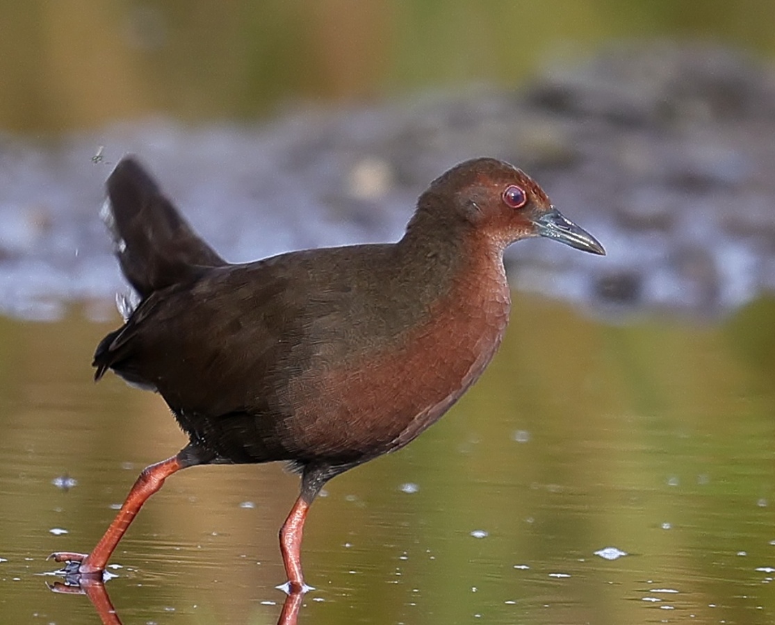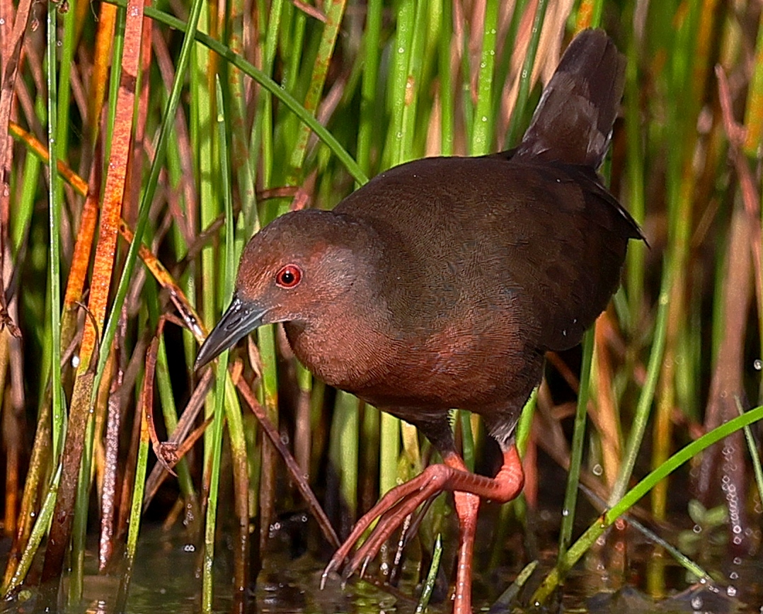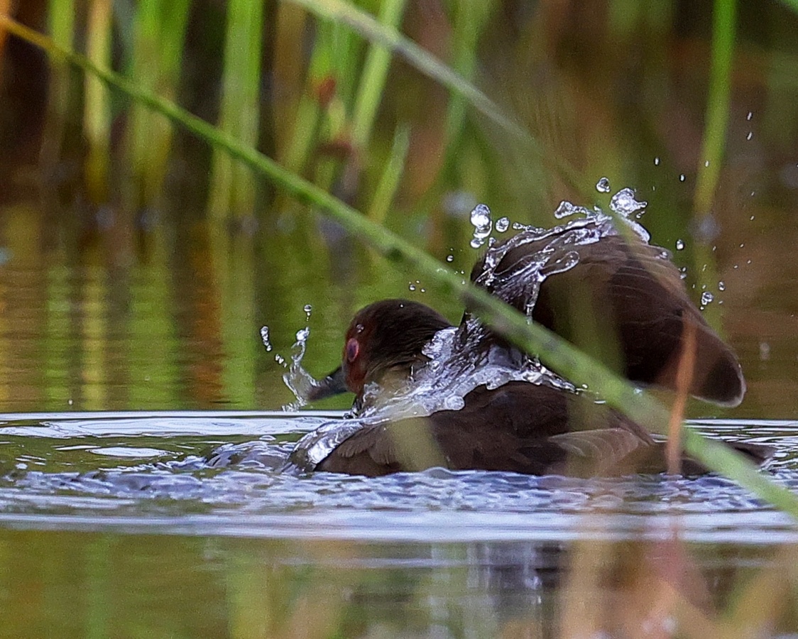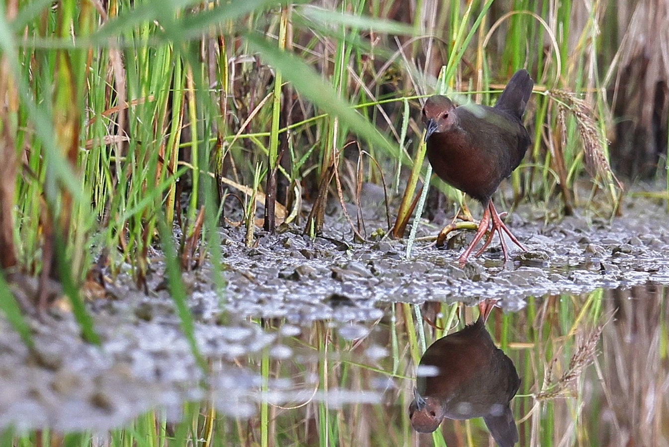 昨日の早朝の写真です。 最近2~3度見かけた場所で出てくれるのを待っていると、1時間位のうちに3回ほど現れてくれましたが、台風の影響か途中で大粒の雨が降るなどして急に暗くなったり明るくなったりと、カメラの設定があわただしい撮影でした!……(笑)   ヒクイナ君が気にならない位の距離を保ち~約80mから一番近づいてくれた40m位まで……なるべく動かずにじっと我慢です!(笑)