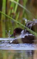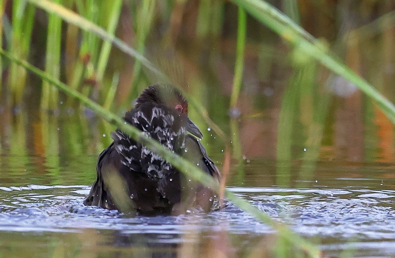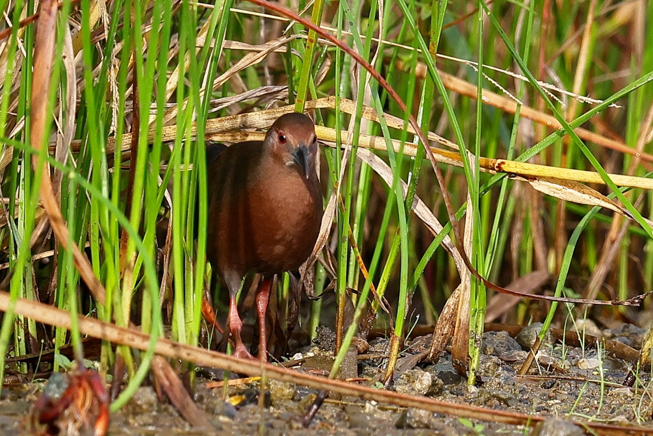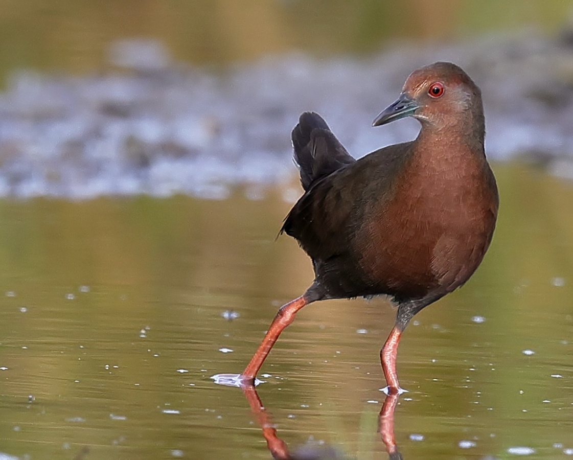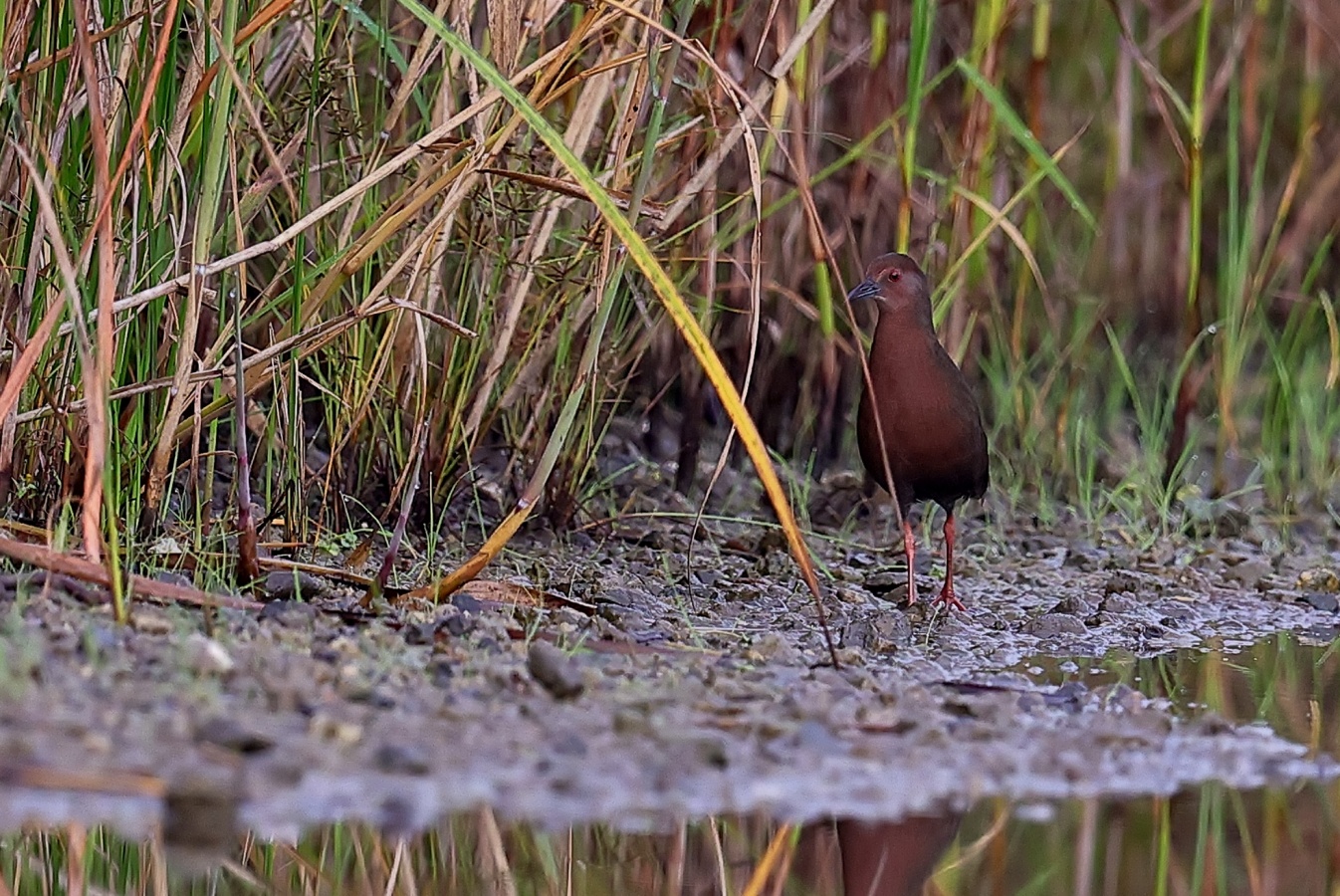 昨日の早朝の写真です。 最近2~3度見かけた場所で出てくれるのを待っていると、1時間位のうちに3回ほど現れてくれましたが、台風の影響か途中で大粒の雨が降るなどして急に暗くなったり明るくなったりと、カメラの設定があわただしい撮影でした!……(笑)   ヒクイナ君が気にならない位の距離を保ち~約80mから一番近づいてくれた40m位まで……なるべく動かずにじっと我慢です!(笑)