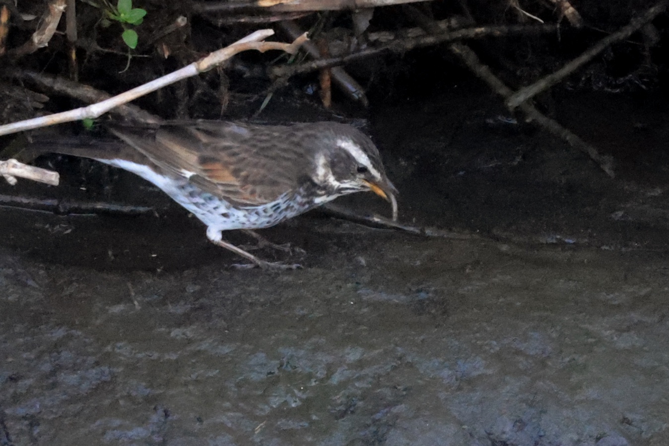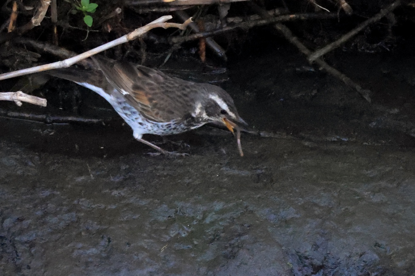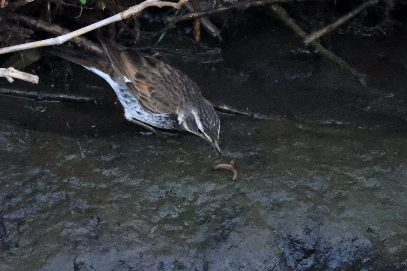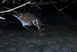 チョット大き目なミミズを食べた後はだいぶ長い間、休憩をしていたツグミ……。