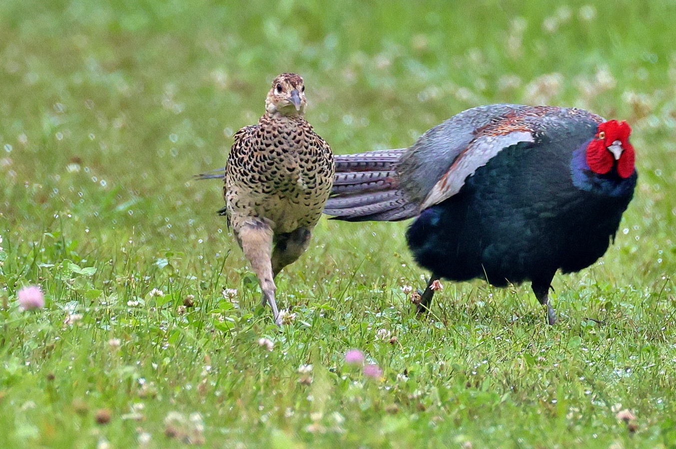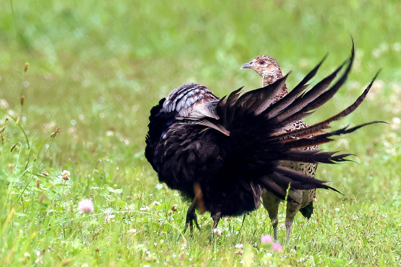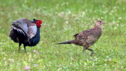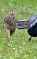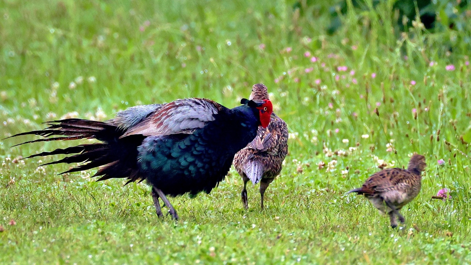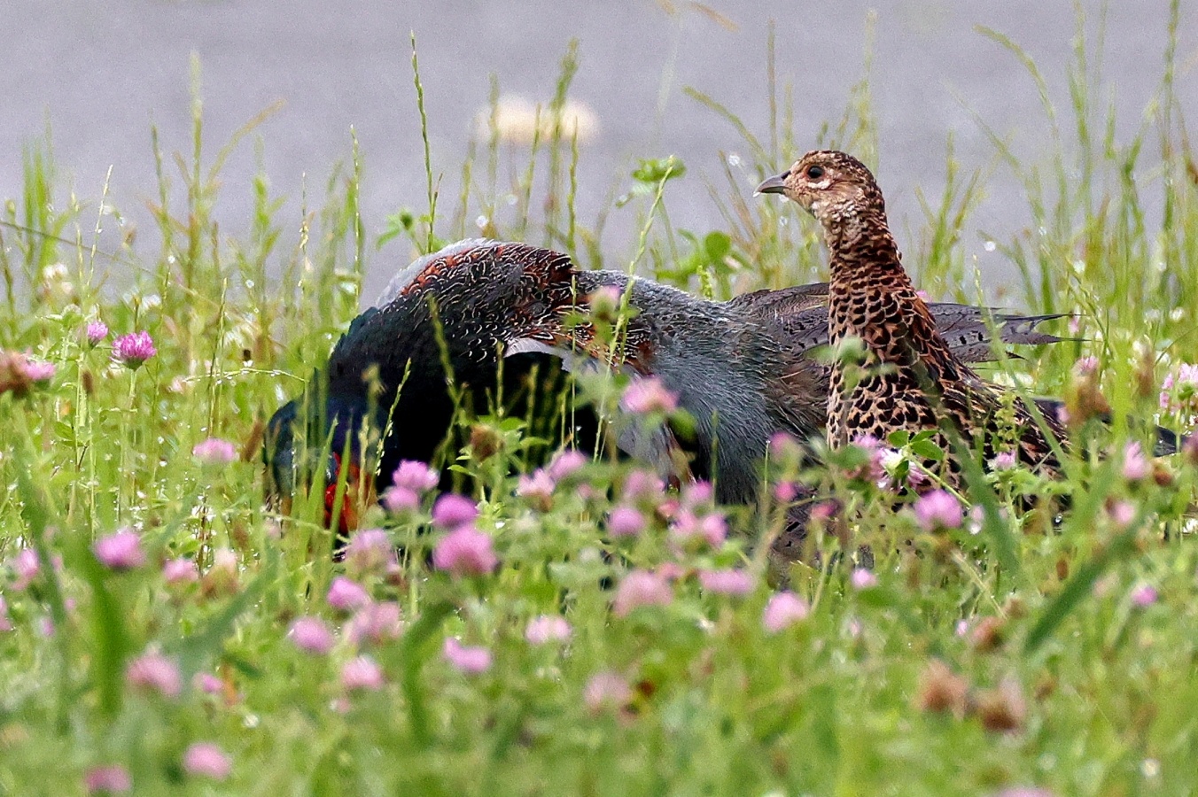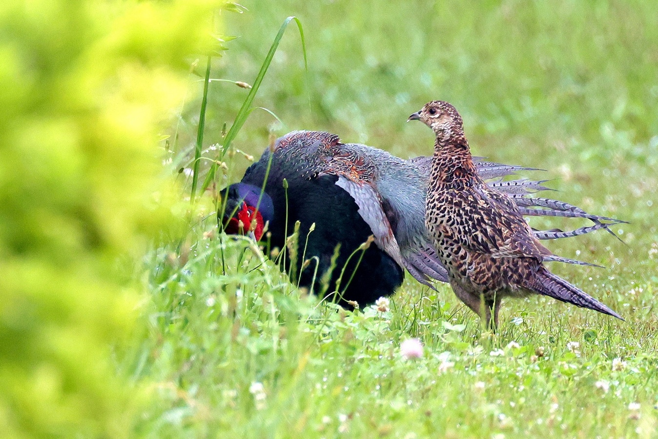 キジの幼鳥と♀親が昨日の雨の合間にだいぶ離れた場所に出てきていました。……しかも昨日は♂親も一緒で♀のキジに対して一生懸命