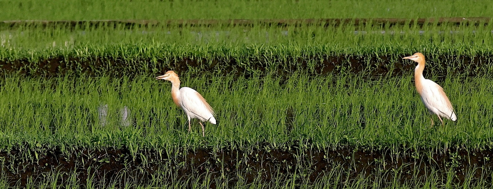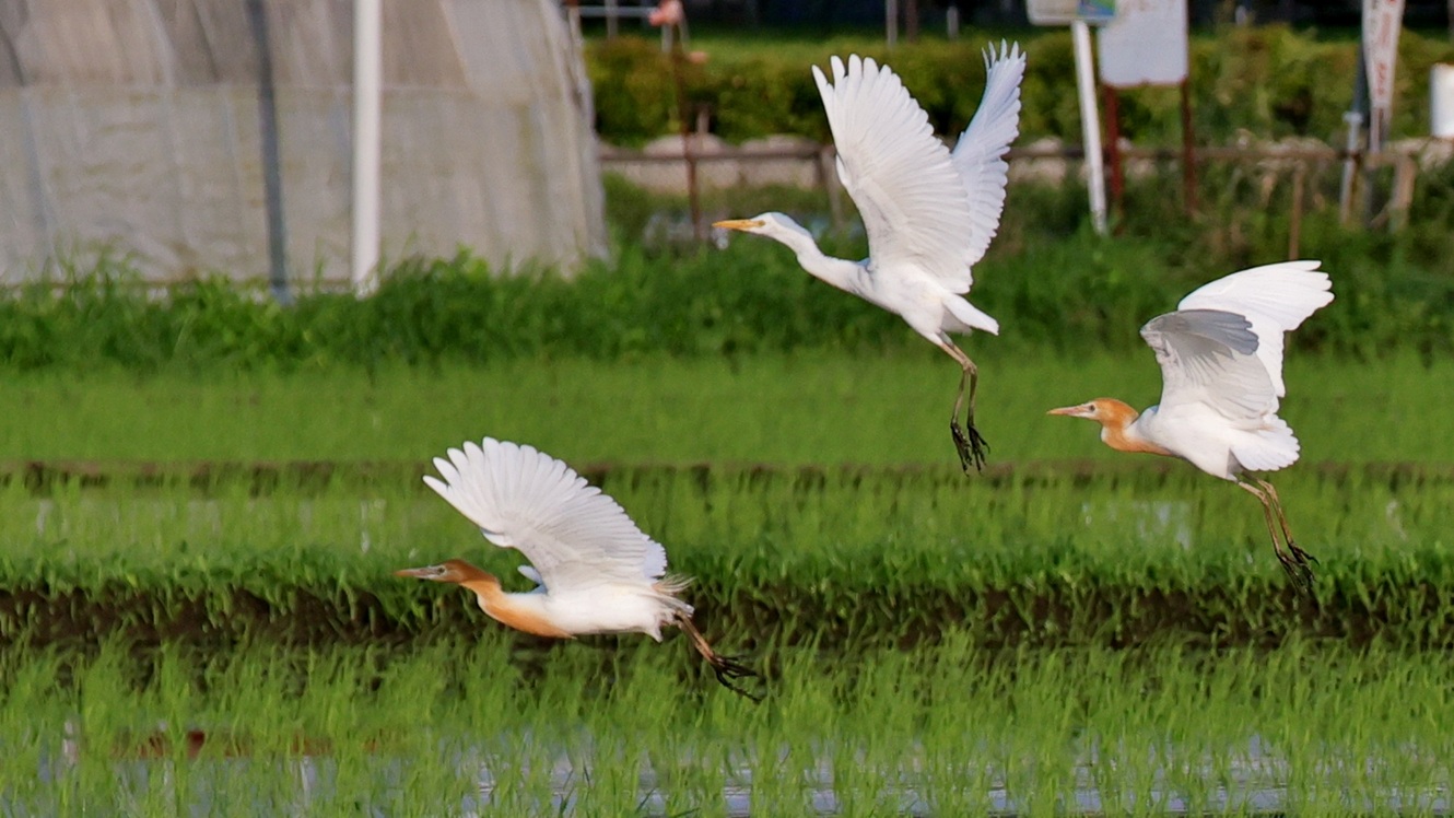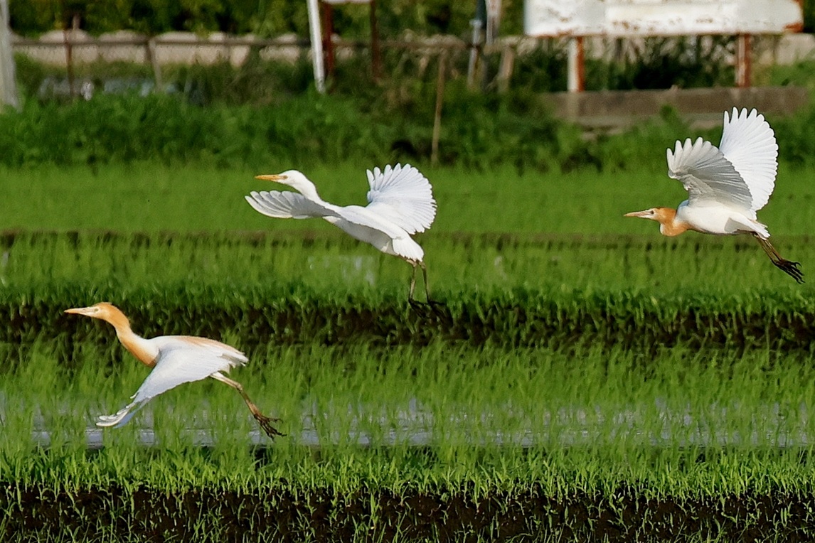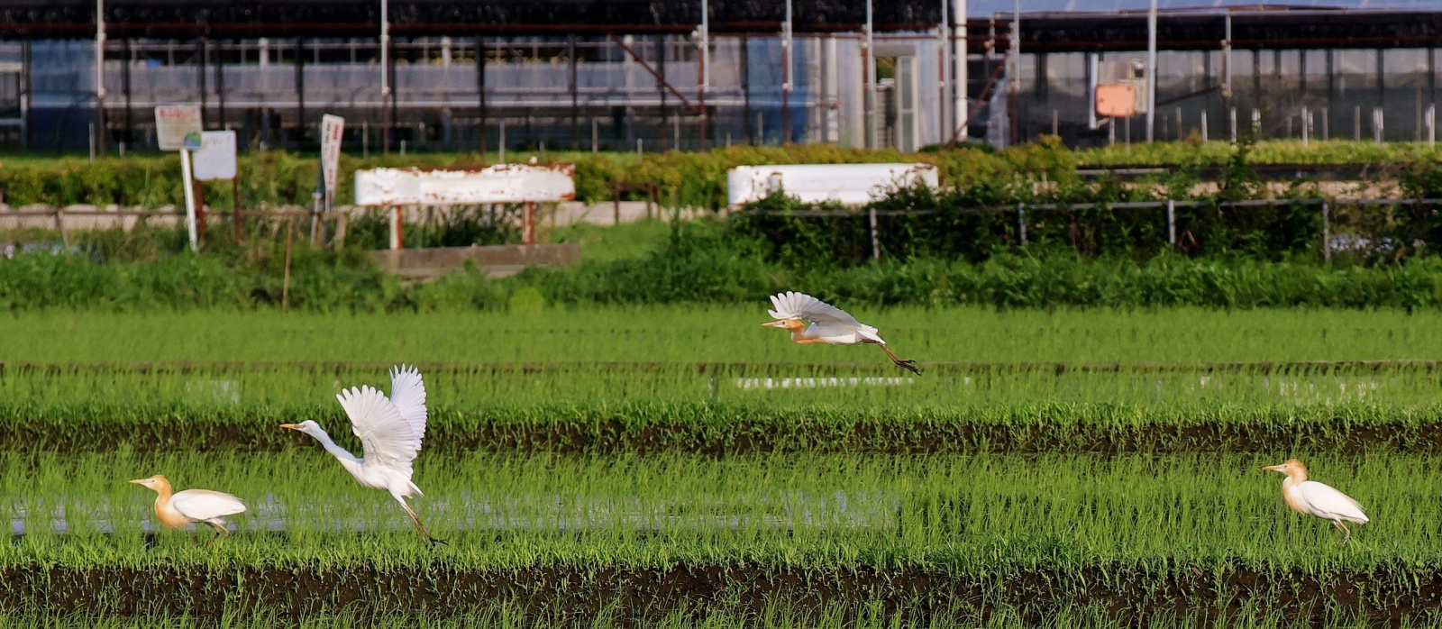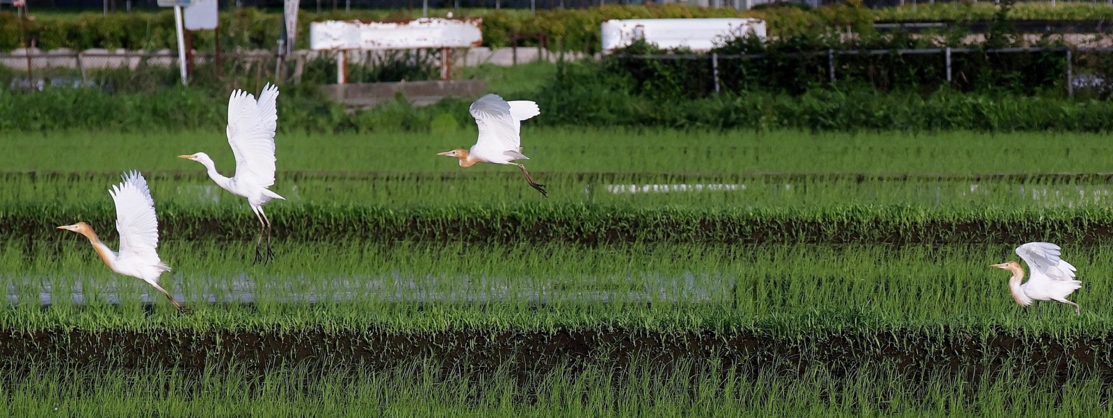 合鴨農法の可愛い雛達を撮っていたらその少し先の田圃に久しぶりにアマサギが4羽!~♪     後で判ったのですがこの日一日だけこの田圃で休んでいた様です~!割とオレンジの色が鮮やかなアマサギ3羽と1羽は胸に少し色が出かかっている綺麗な白のアマサギ!~♪ 合鴨を撮りに行って思わずラッキーな事に~🎵アマサギ君達に出会いました!~♪