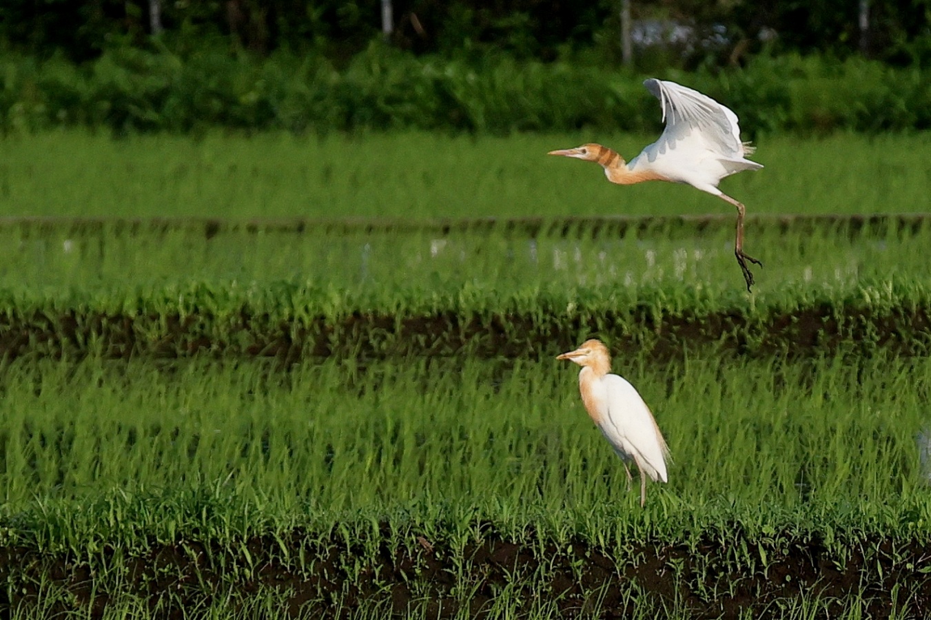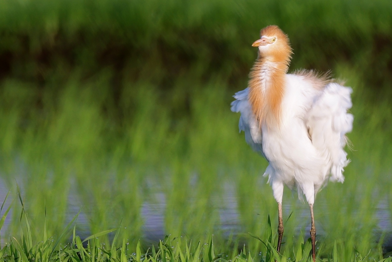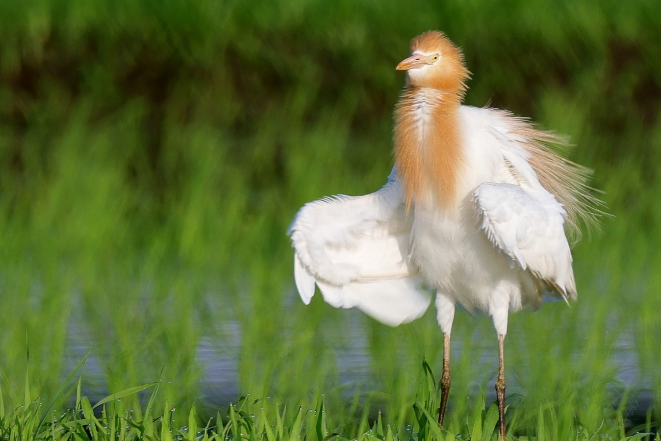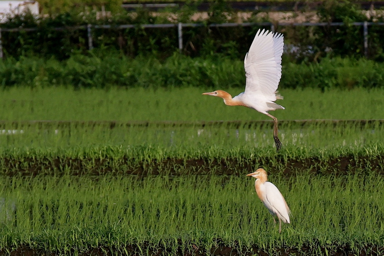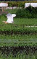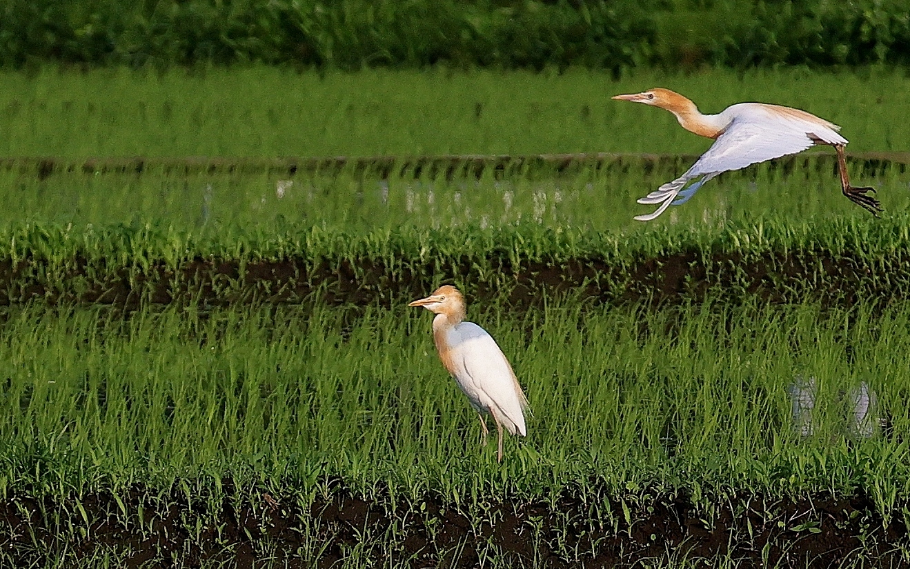 合鴨農法の可愛い雛達を撮っていたらその少し先の田圃に久しぶりにアマサギが4羽!~♪     後で判ったのですがこの日一日だけこの田圃で休んでいた様です~!割とオレンジの色が鮮やかなアマサギ3羽と1羽は胸に少し色が出かかっている綺麗な白のアマサギ!~♪ 合鴨を撮りに行って思わずラッキーな事に~🎵アマサギ君達に出会いました!~♪