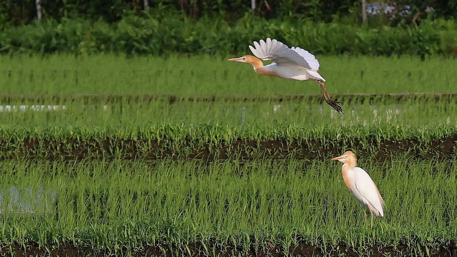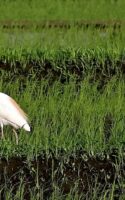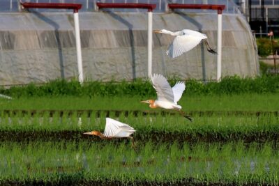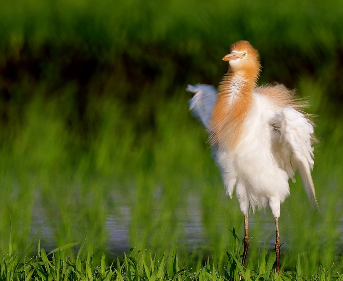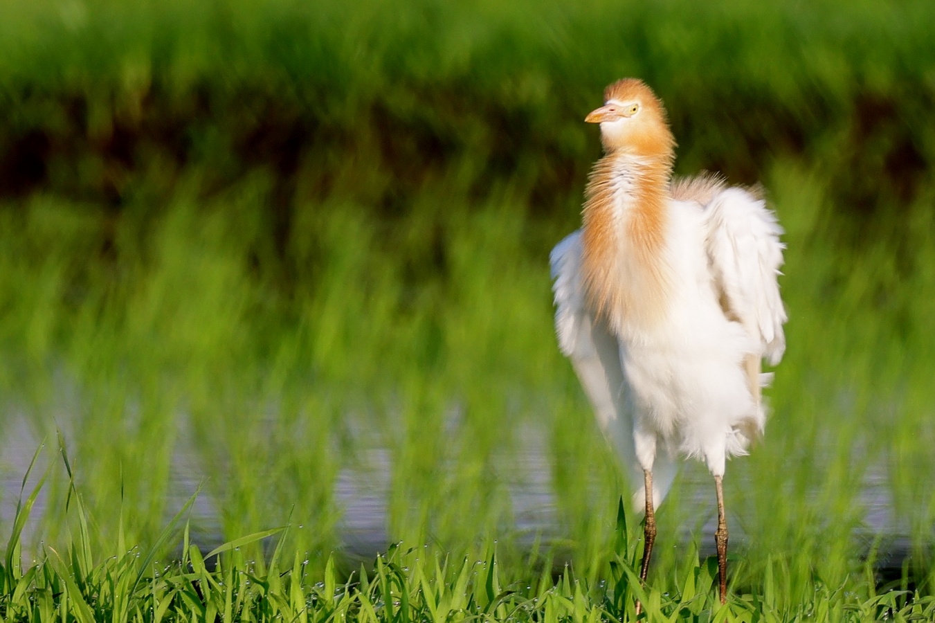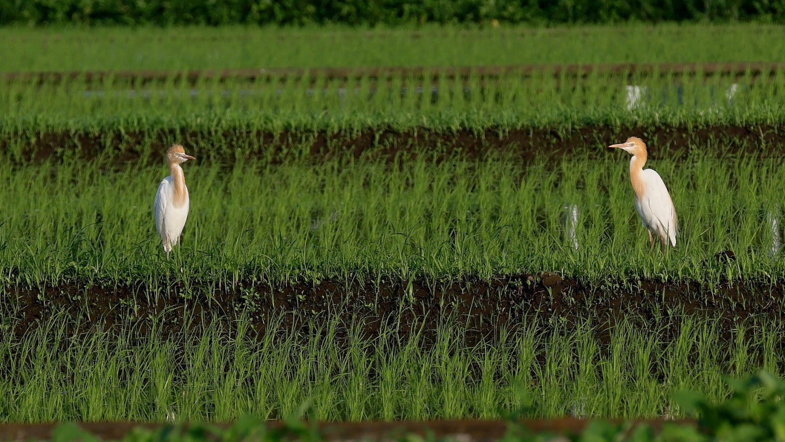合鴨農法の可愛い雛達を撮っていたらその少し先の田圃に久しぶりにアマサギが4羽!~♪     後で判ったのですがこの日一日だけこの田圃で休んでいた様です~!割とオレンジの色が鮮やかなアマサギ3羽と1羽は胸に少し色が出かかっている綺麗な白のアマサギ!~♪ 合鴨を撮りに行って思わずラッキーな事に~🎵アマサギ君達に出会いました!~♪