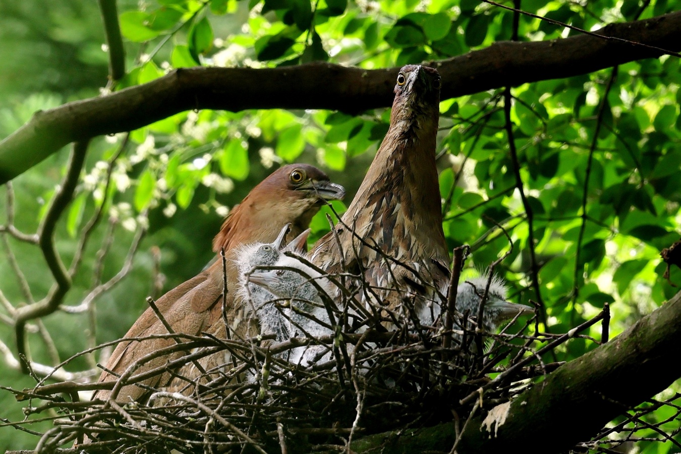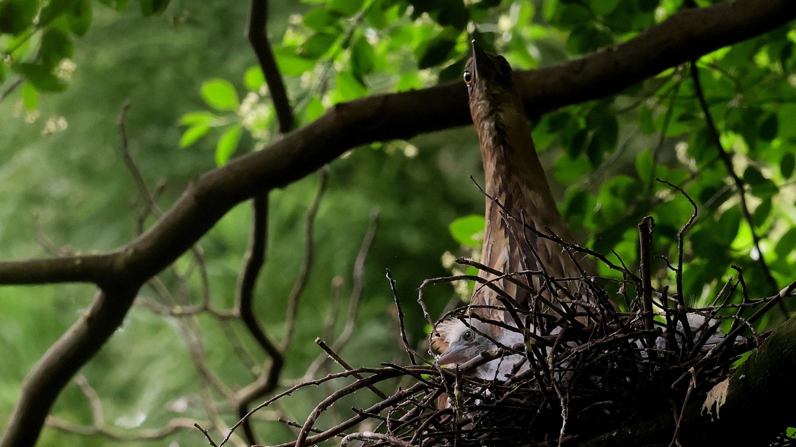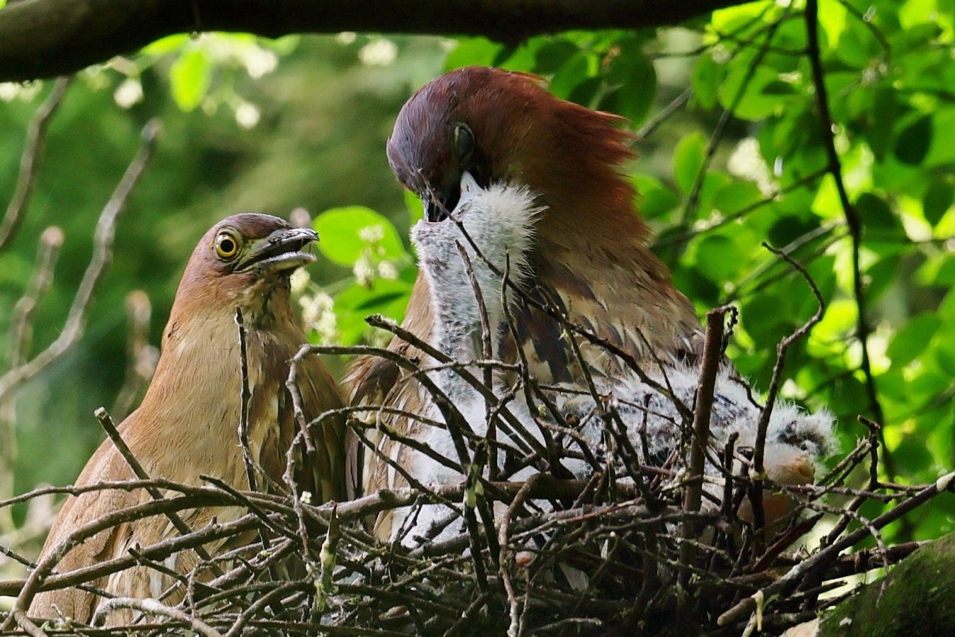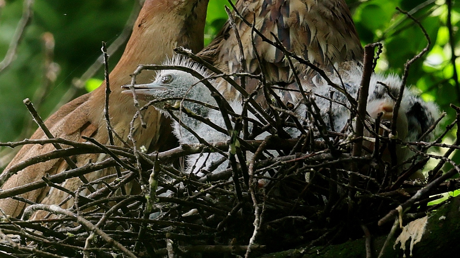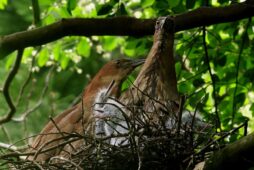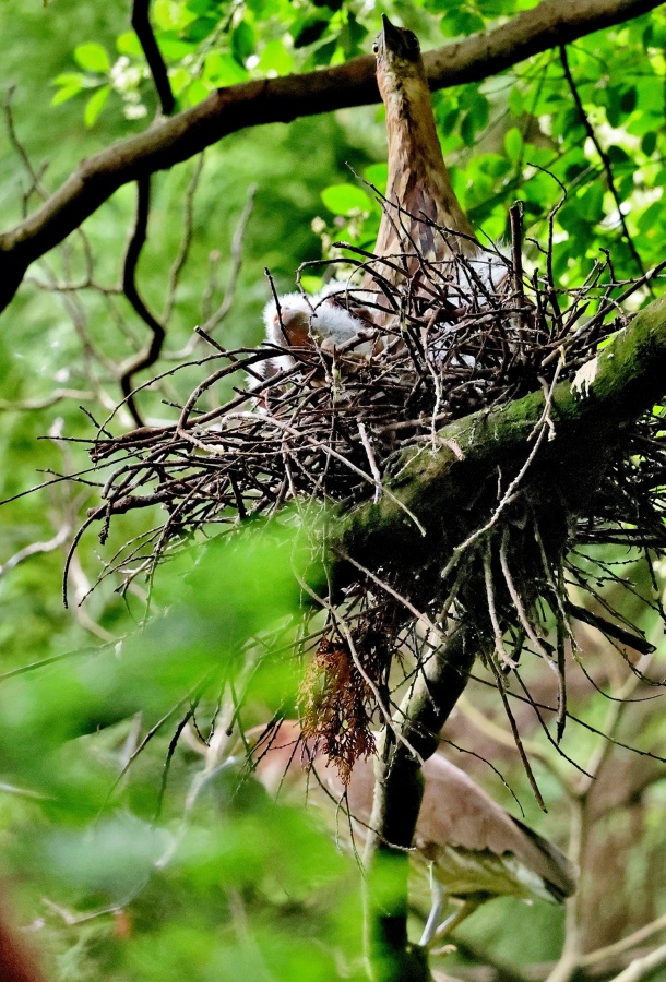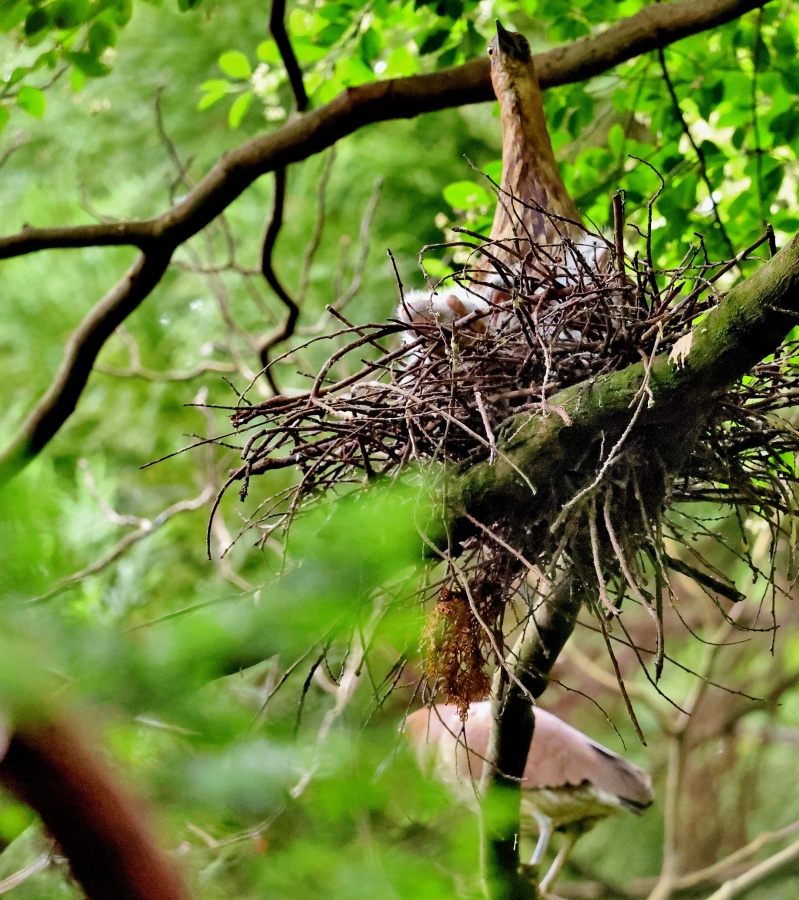 ミゾゴイの雛と給仕・長く伸びた強烈な…〇ンPー!…(笑)給仕でおやの顔から眼まで呑み込んでもらう様子や~はげしい給仕など沢山撮れました!~♪