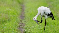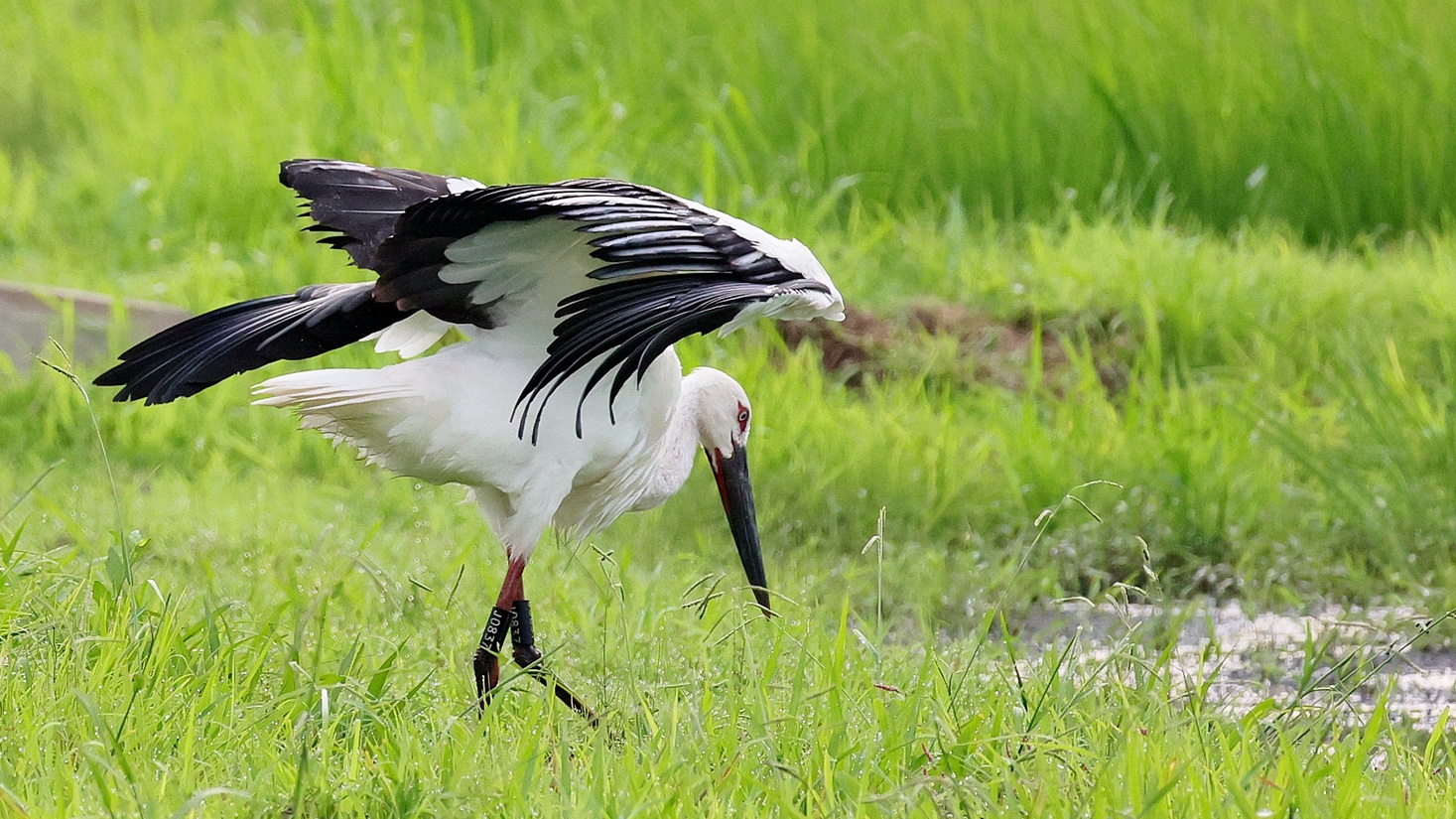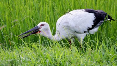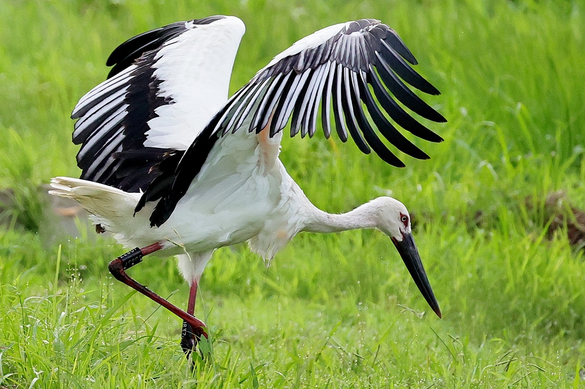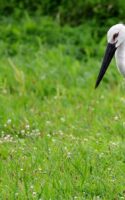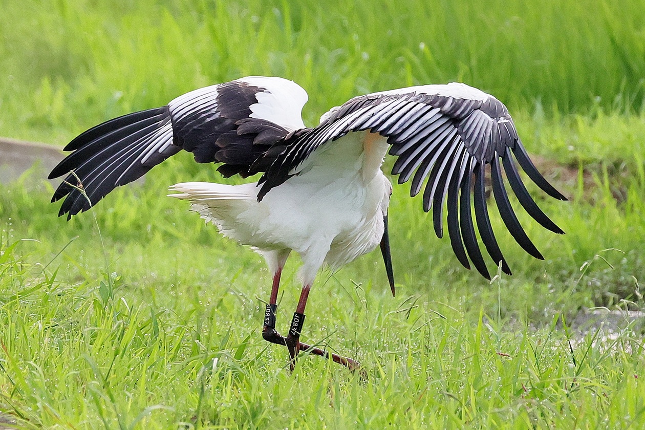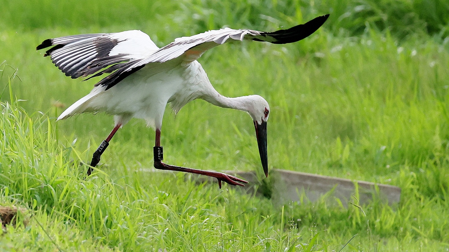 コウノトリが来ていると連絡が入り早朝まだ誰も居ない所で、人馴れしているのか?どんどん近づいてくる若い(識別番号からまだ3カ月の…)幼鳥?が……