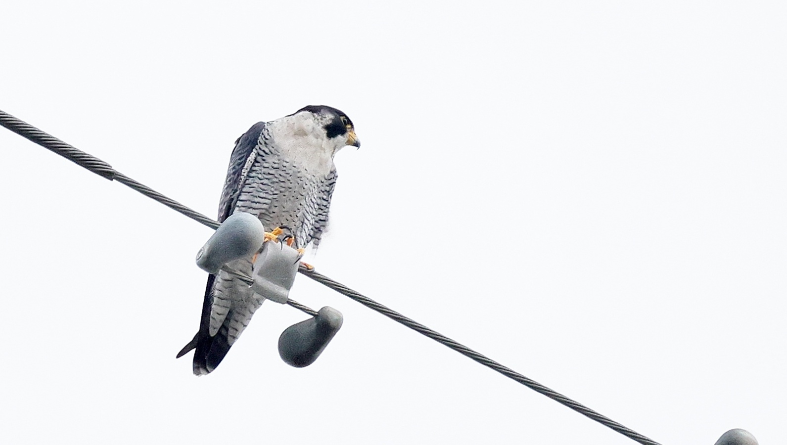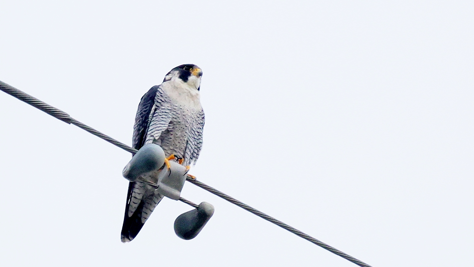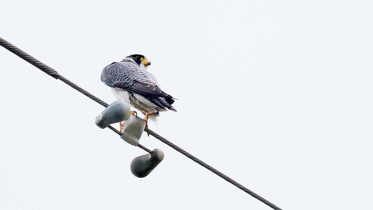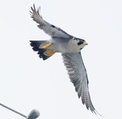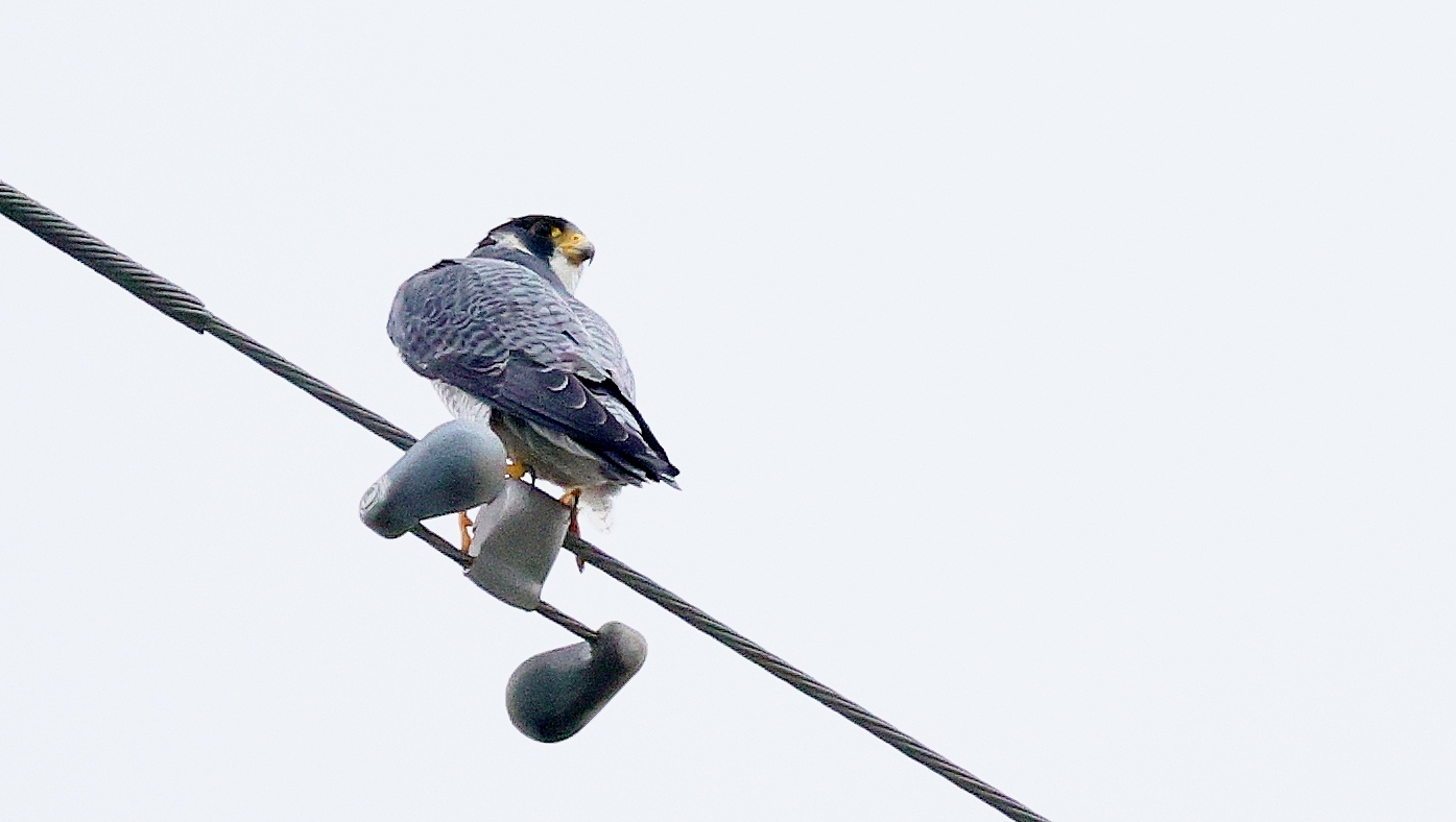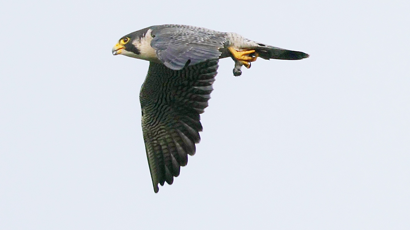 久しぶりに公園に来るハヤブサが鉄塔の上で獲物を狙って待ち構えているのが見れました…… しかしなんども飛び立ってもなかなか獲物を確保できずにずっと様子を伺っていました……。    諦めて早朝鳥撮りの時間制約から戻る途中で~タイミングよくハヤブサが上を飛んでいるのを撮ったら小鳥を確保して掴み……鉄柱の上での朝食に向かうところが撮れました!~♪