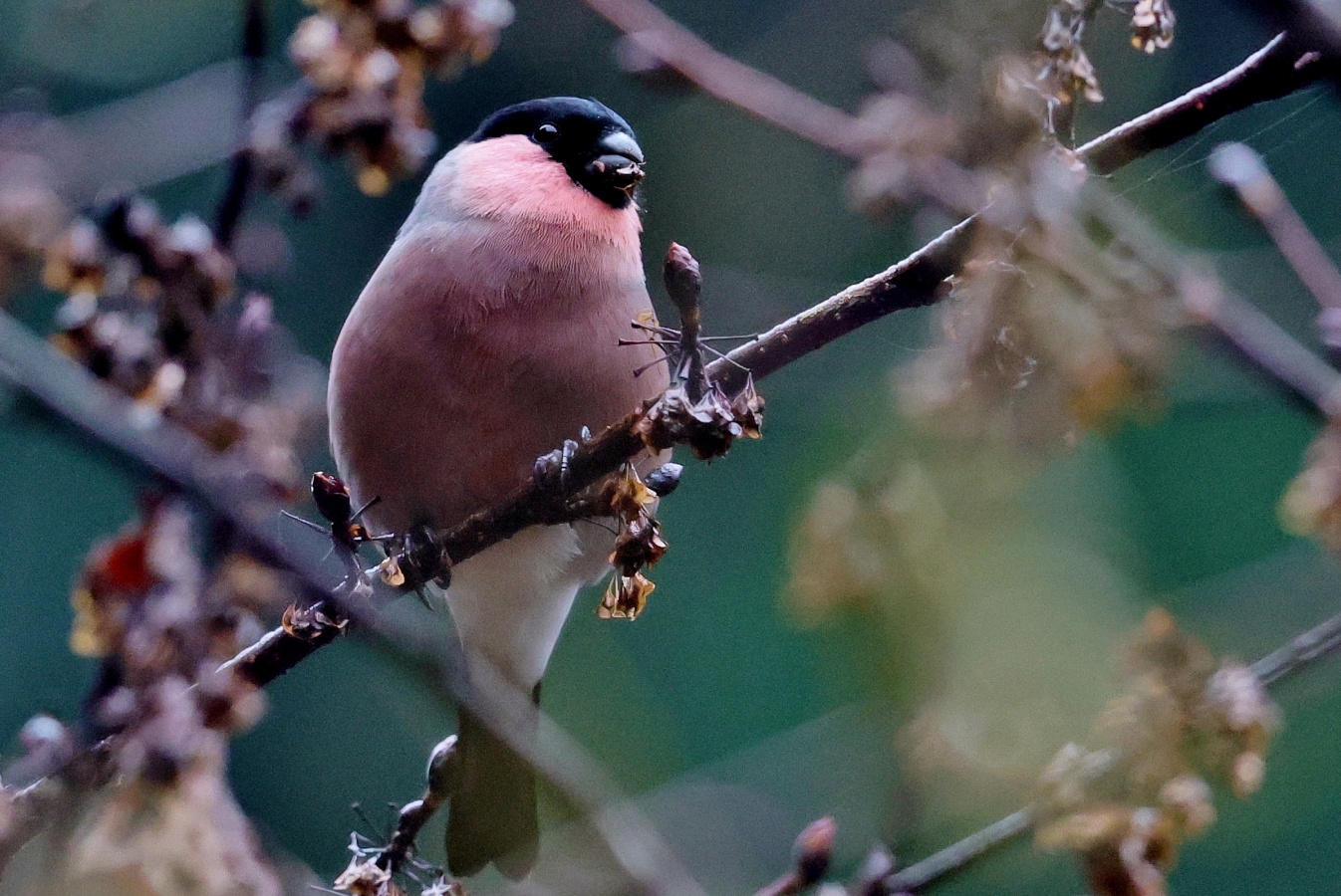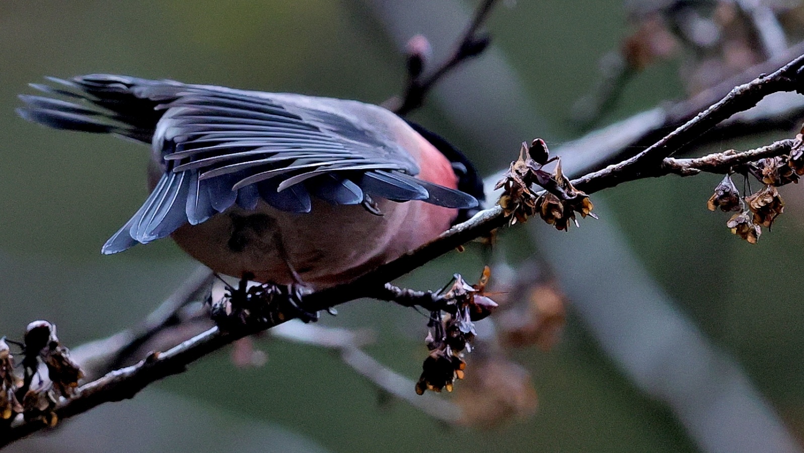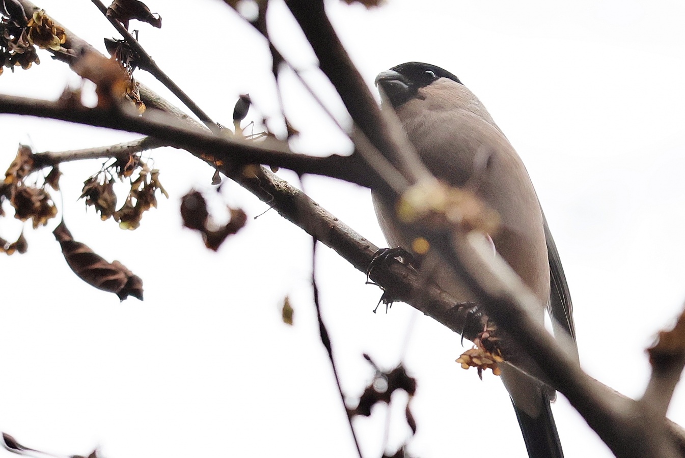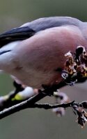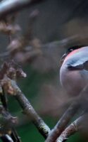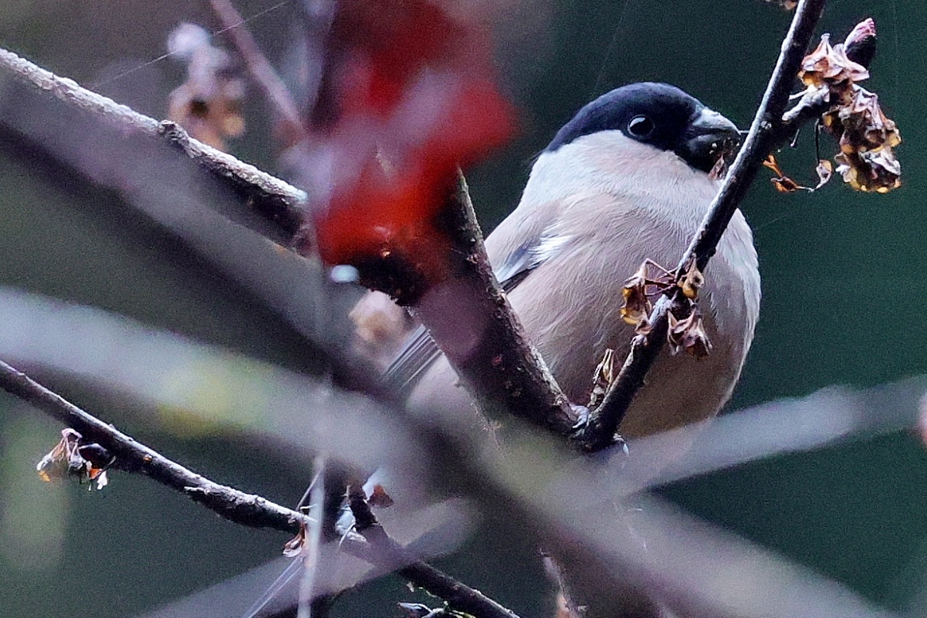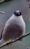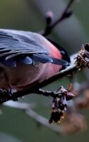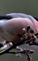 6~7羽のウソの群れが一生懸命”朝食を啄ばんでいました……… ♂はアカウソと呼ばれる胸全体が