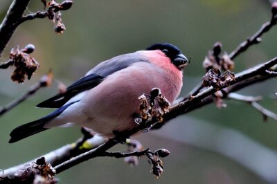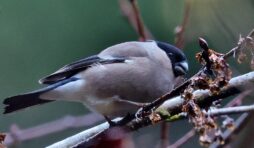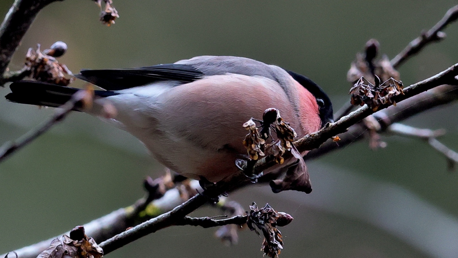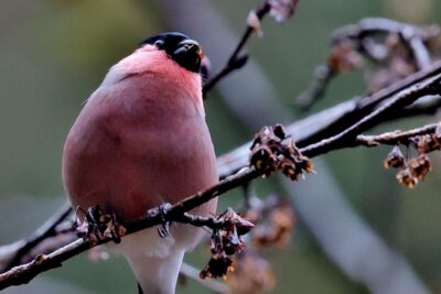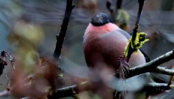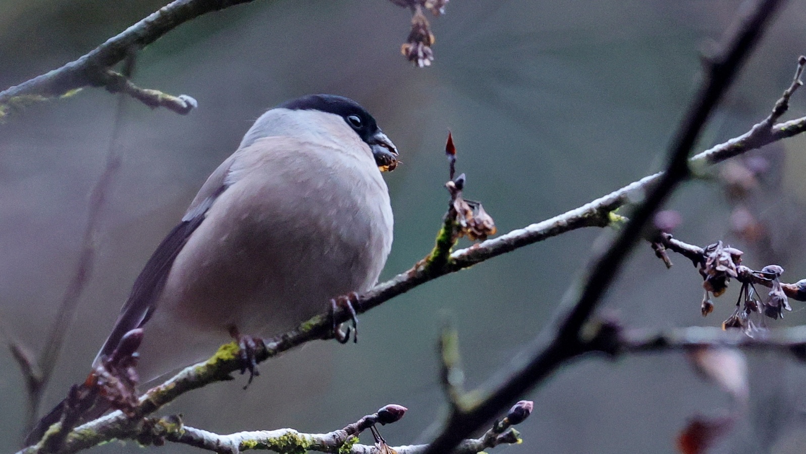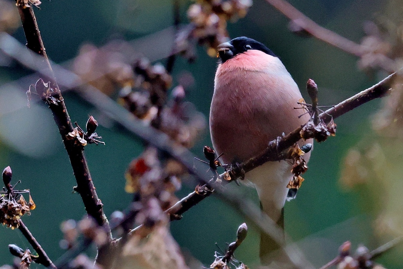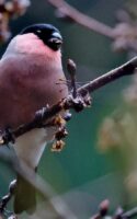 6~7羽のウソの群れが一生懸命”朝食を啄ばんでいました……… ♂はアカウソと呼ばれる胸全体が