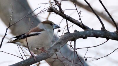 後でお会いしたカメラマンの話で『前日はまったく鳥が居なかった!』との事でしたが……撮り始めて直ぐにウソが現れ、もう居なくなったと聞いたベニマシコ♂も